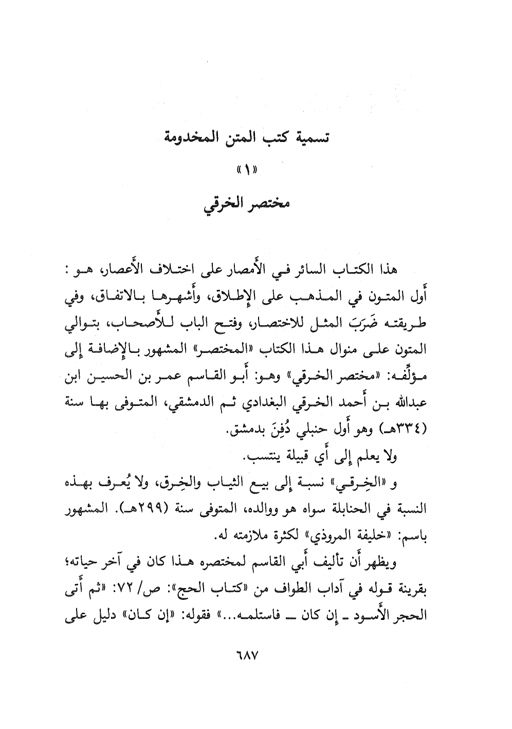 هذا الكتاب السائر في الأمصار على اختلاف الأعصار هو: أول المتون في المذهب على الإطلاق، وأشهرها بالاتفاق، وفي طريقته ضرب المثل للاختصار وفتح الباب للأصحاب، بتوالي المتون على منوال هذا الكتاب " المختصر " المشهور بالإضافة إلى مؤلفه: " مختصر الخرقي " وهو أبو القاسم عمر بن الحسين ابن عبد الله بن أحمد الخرقي البغدادي ثم الدمشقي، المتوفى بها سنة (٣٣٤ هـ) وهو أول حنبلي دفن بدمشق.