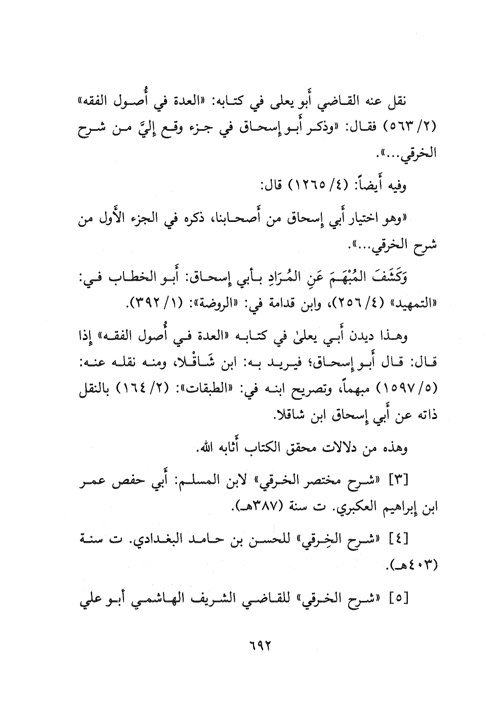 وهذا ديدن أبي يعلى في كتابه " العدة في أصول الفقه " إذا قال: قال أبو إسحاق؛ فيريد به: ابن شاقلا، ومنه نقله عنه: (٥/١٥٩٧) مبهما، وتصريح ابنه في: " الطبقات ": (٢/ ١٦٤) بالنقل ذاته عن أبي إسحاق ابن شاقلا.