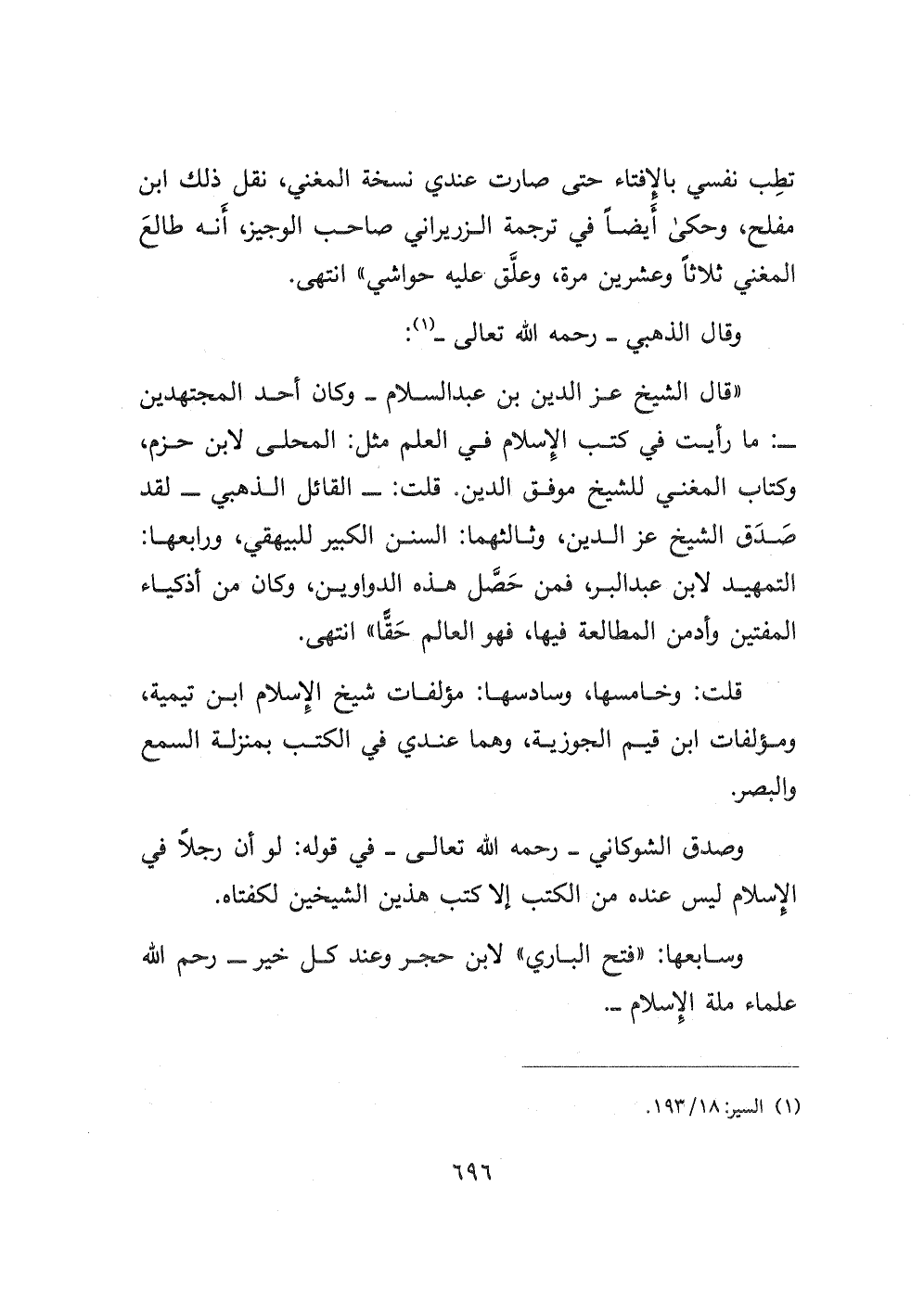 " قال الشيخ عز الدين بن عبد السلام - وكان أحد المجتهدين -: ما رأيت في كتب الإسلام في العلم مثل: المحلى لابن حزم، وكتاب المغني للشيخ موفق الدين. قلت: - القائل الذهبي - لقد صدق الشيخ عز الدين، وثالثهما: السنن الكبير للبيهقي، ورابعها: التمهيد لابن عبد البر فمن حصل هذه الدواوين، وكان من أذكياء المفتين وأدمن المطالعة فيها، فهو العالم حقا " انتهى.