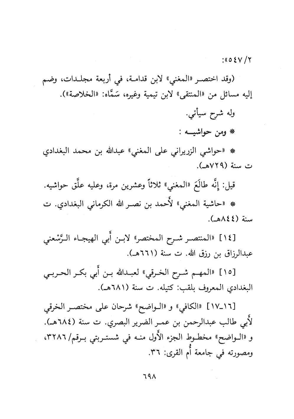 ٢/٥٤٧ ": (وقد اختصر " المغني " لابن قدامة، في أربعة مجلدات، وضم إليه مسائل من المنتقى " لابن تيمية وغيره، سماه: " الخلاصة ") .