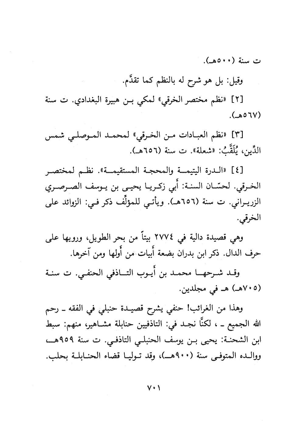 ٤- " الدرة اليتيمة والمحجة المستقيمة ". نظم لمختصر الخرقي. لحسان السنة: أبي زكريا يحيى بن يوسف الصرصري الزريراني ت سنة (٦٥٦ هـ) . ويأتي للمؤلف ذكر في: الزوائد على الخرقي.