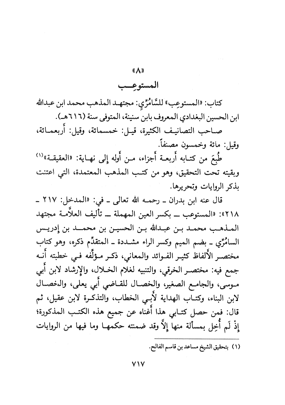 كتاب: " المستوعب " للسَّامُرِّيِ: مجتهد المذهب محمد ابن عبد الله ابن الحسين البغدادي المعروف بابن سنينة، المتوفى سنة (٦١٦ هـ) . صاحب التصانيف الكثيرة، قيل: خمسمائة، وقيل: أربعمائة، وقيل: مائة وخمسون مصنفا.
