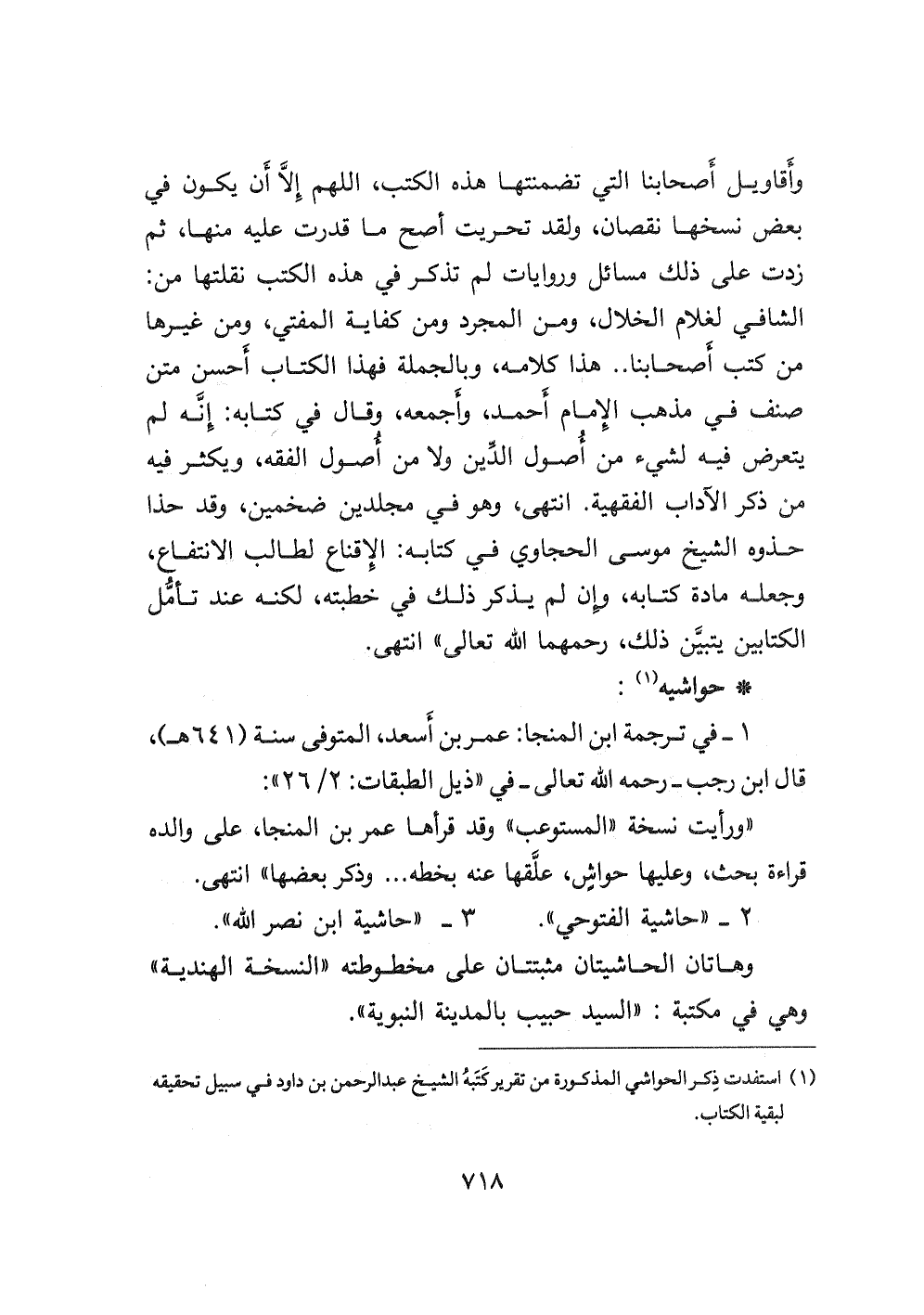 وأقاويل أصحابنا التي تضمنتها هذه الكتب، اللهم إلا أن يكون في بعض نسخها نقصان، ولقد تحريت أصح ما قدرت عليه منها، ثم زدت على ذلك مسائل وروايات لم تذكر في هذه الكتب نقلتها من: الشافي لغلام الخلال، ومن المجرد ومن كفاية المفتي، ومن غيرها من كتب أصحابنا.. هذا كلامه، وبالجملة فهذا الكتاب أحسن متن صنف في مذهب الإمام أحمد، وأجمعه، وقال في كتابه: إنه لم يتعرض فيه لشيء من أصول الدين ولا من أصول الفقه، ويكثر فيه من ذكر الآداب الفقهية. انتهى، وهو في مجلدين ضخمين، وقد حذا حذوه الشيخ موسى الحجاوي في كتابه: الإقناع لطالب الانتفاع، وجعله مادة كتابه، وإن لم يذكر ذلك في خطبته، لكنه عند تأمل الكتابين يتبين ذلك، رحمهما الله تعالى " انتهى.