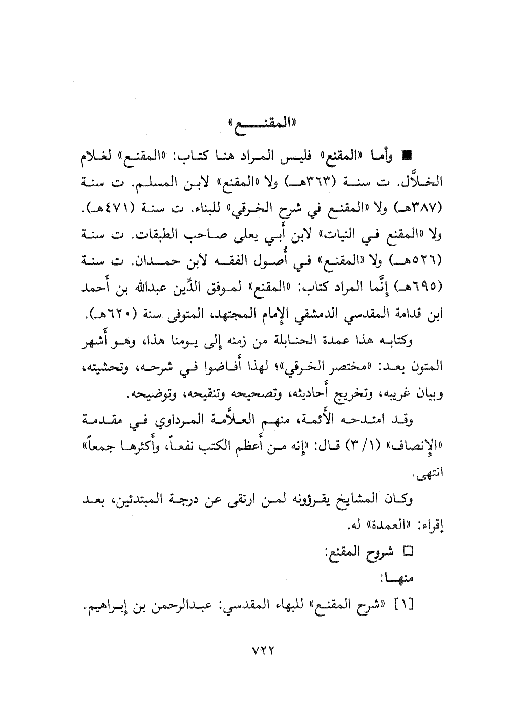 * وأما " المقنع " فليس المراد هنا كتاب: " المقنع " لغلام الخلال ت سنة (٣٦٣ هـ) ولا " المقنع " لابن المسلم ت سنة (٣٨٧ هـ) ولا " المقنع في شرح الخرقي " للبناء ت سنة (٤٧١ هـ) . ولا " المقنع في النيات " لابن أبي يعلى صاحب الطبقات ت سنة (٥٢٦ هـ) ولا " المقنع " في أصول الفقه لابن حمدان ت سنة (٦٩٥ هـ) إنما المراد كتاب: " المقنع " لموفق الدين عبد الله بن أحمد ابن قدامة المقدسي الدمشقي الإمام المجتهد، المتوفى سنة (٦٢٠ هـ) . وكتابه هذا عمدة الحنابلة من زمنه إلى يومنا هذا، وهو أشهر المتون بعد: " مختصر الخرقي "؛ لهذا أفاضوا في شرحه، وتحشيته، وبيان غريبه، وتخريج أحاديثه، وتصحيحه وتنقيحه، وتوضيحه.