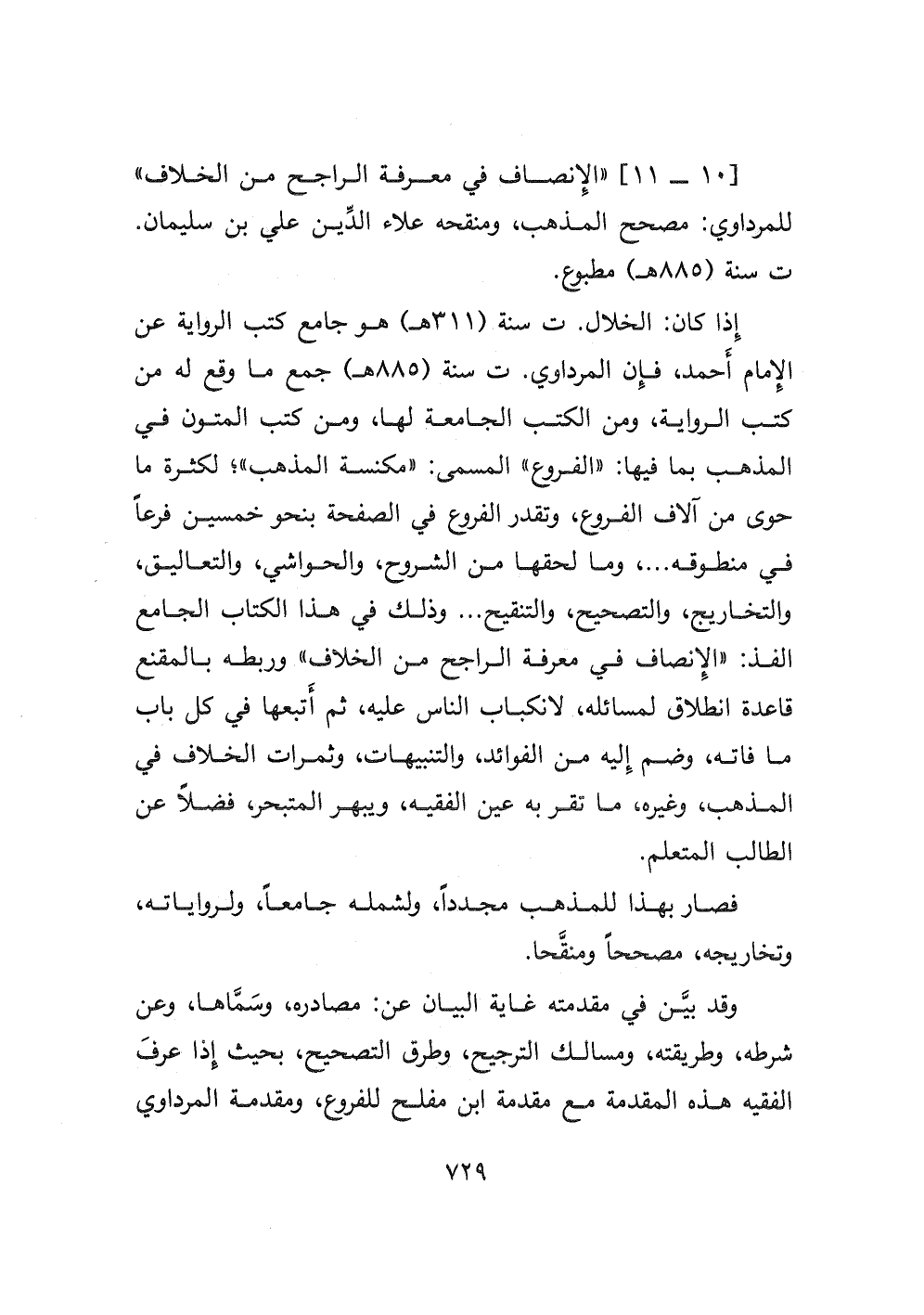 ١٠-١١ - " الإنصاف في معرفة الراجح من الخلاف " للمرداوي: مصحح المذهب، ومنقحه علاء الدين علي بن سليمان ت سنة (٨٨٥ هـ) مطبوع.