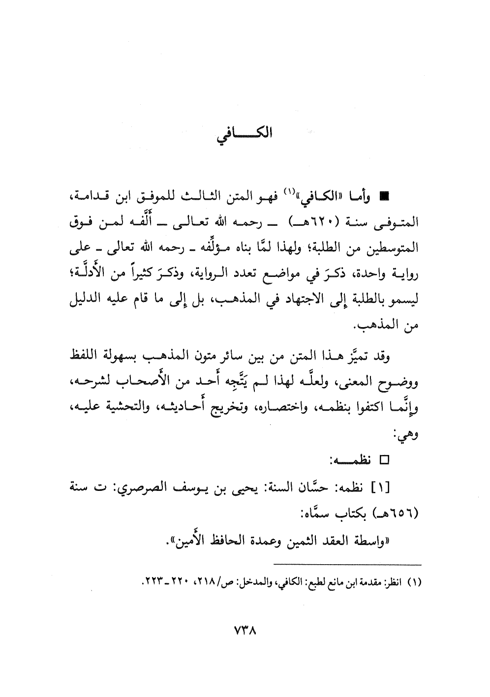 * وأما " الكافي " (١) فهو المتن الثالث للموفق ابن قدامة، المتوفى سنة (٦٢٠ هـ) - رحمه الله تعالى- ألفه لمن فوق المتوسطين من الطلبة؛ ولهذا لما بناه مؤلفه - رحمه الله تعالى - على رواية واحدة، ذكر في مواضع تعدد الرواية، وذكر كثيرا من الأدلة؛ ليسمو بالطلبة إلى الاجتهاد في المذهب، بل إلى ما قام عليه الدليل من المذهب.