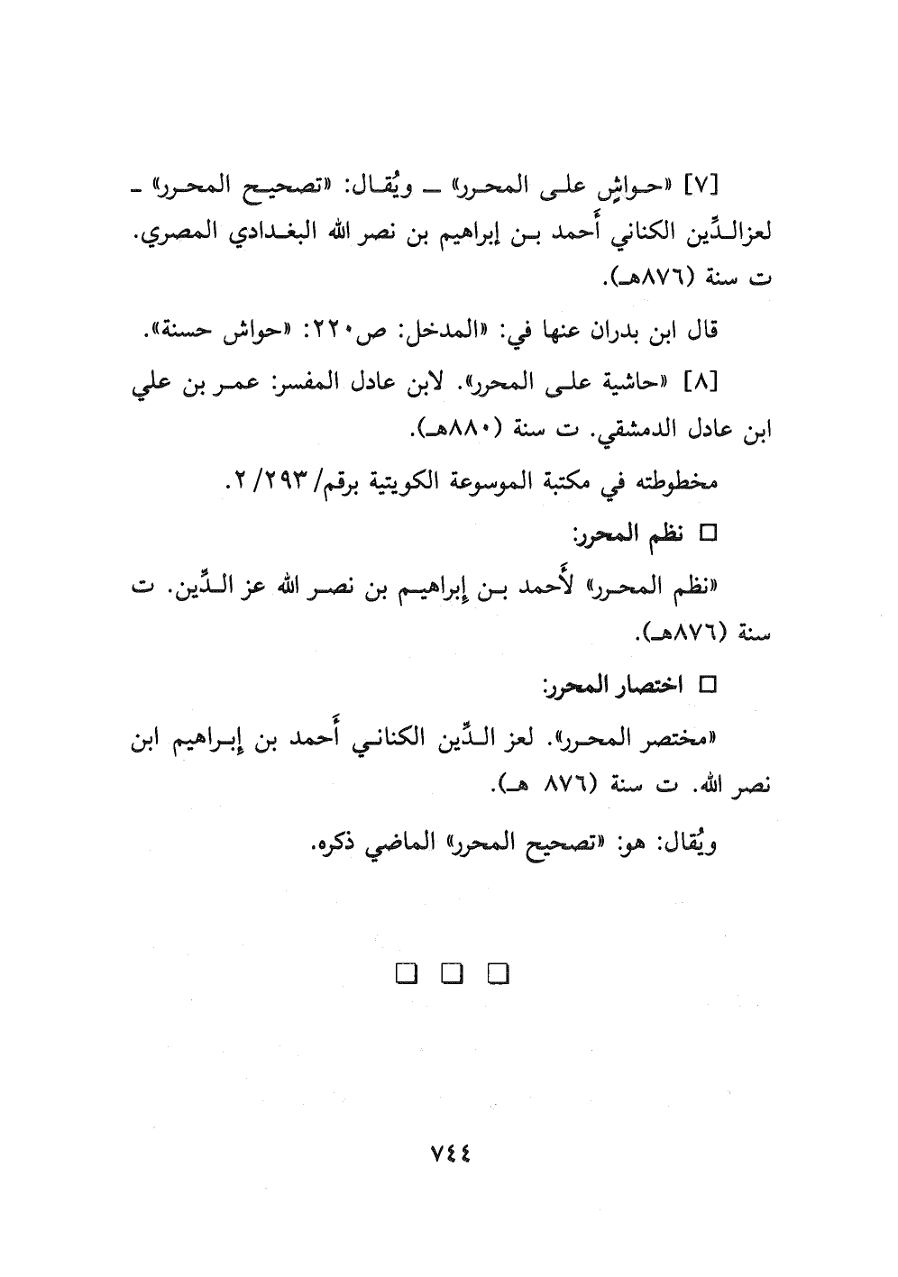 ٧- " حواش على المحرر " - ويقال: " تصحيح المحرر " - لعز الدين الكناني أحمد بن إبراهيم بن نصر الله البغدادي المصري ت سنة (٨٧٦ هـ) .