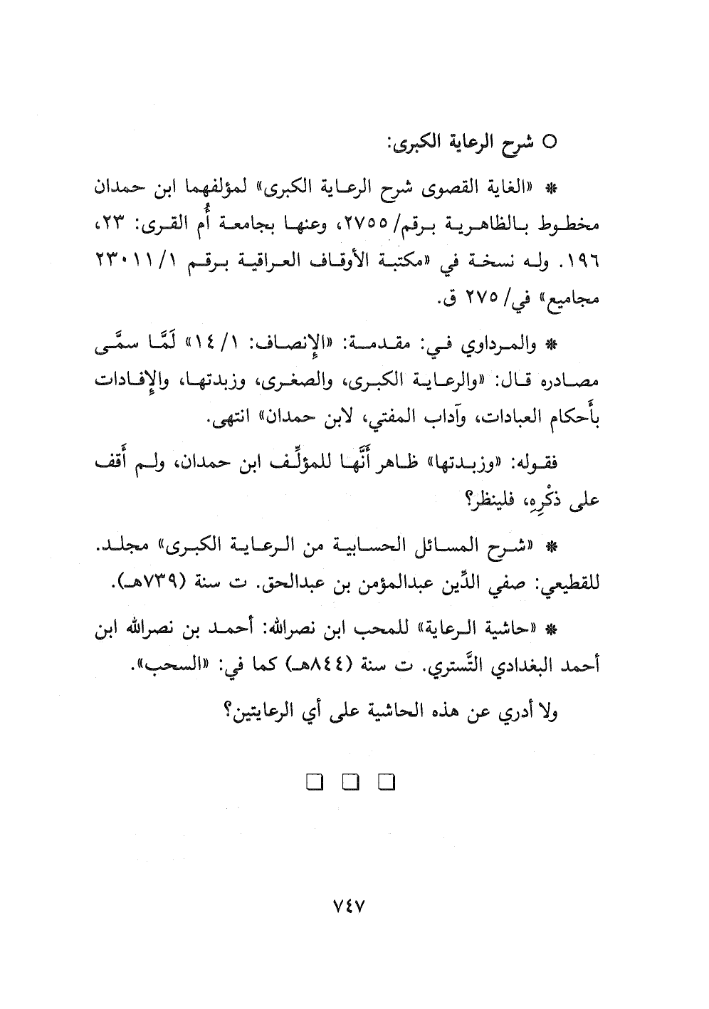 - " الغاية القصوى شرح الرعاية الكبرى " لمؤلفهما ابن حمدان. مخطوط بالظاهرية برقم/٢٧٥٥، وعنها بجامعة أم القرى: ٢٣، ١٩٦. وله نسخه في " مكتبة الأوقاف العراقية برقم ١/ ٢٣٠١١ مجاميع " في/ ٢٧٥ ق.