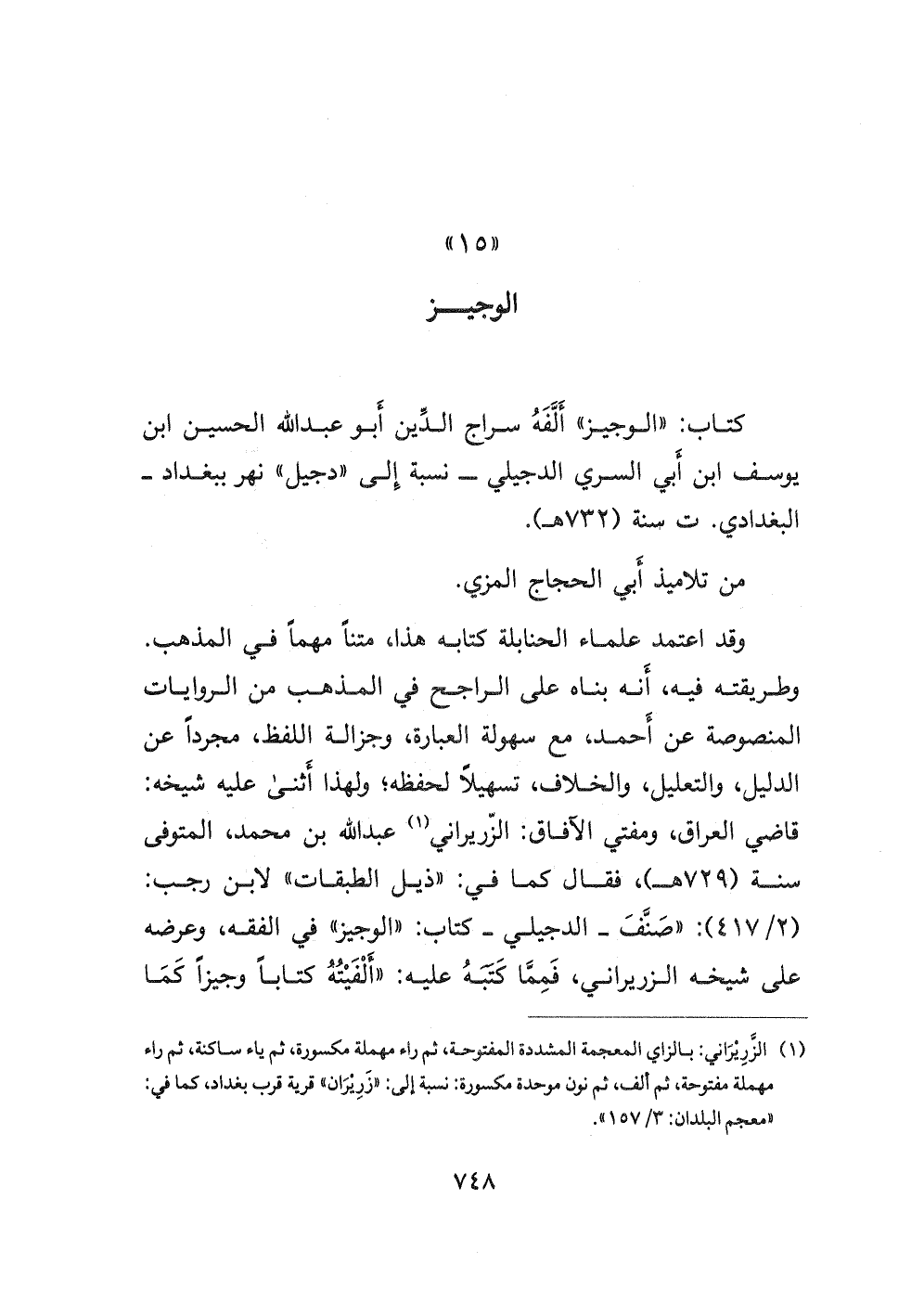 كتاب: " الوجيز " ألفه سراج الدين أبو عبد الله الحسين ابن يوسف ابن أبي السري الدجيلي- نسبة إلى " دجيل " نهر ببغداد البغدادي ت سنة (٧٣٢ هـ) .