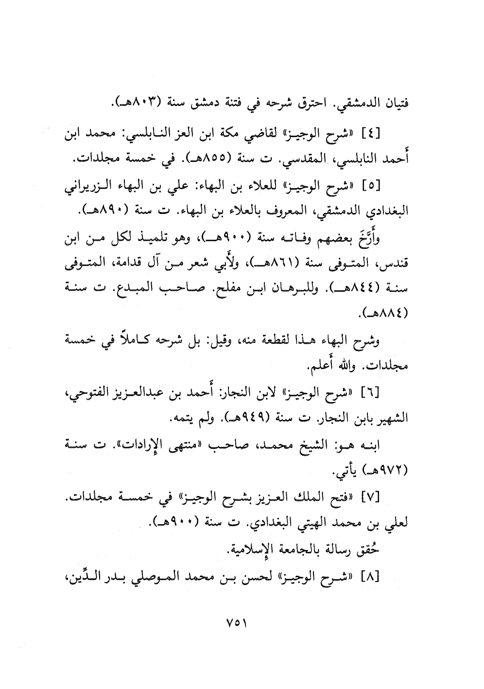 ٥- " شرح الوجيز " للعلاء بن البهاء: علي بن البهاء الزريراني البغدادي الدمشقي، المعروف بالعلاء بن البهاء ت سنة (٨٩٠ هـ) . وأرخ بعضهم وفاته سنة (٩٠٠ هـ) ، وهو تلميذ لكل من ابن قندس، المتوفى سنة (٨٦١ هـ) ، ولأبي شعر من آل قدامة، المتوفى سنة (٨٤٤ هـ) . وللبرهان ابن مفلح صاحب المبدع ت سنة (٨٨٤ هـ) .