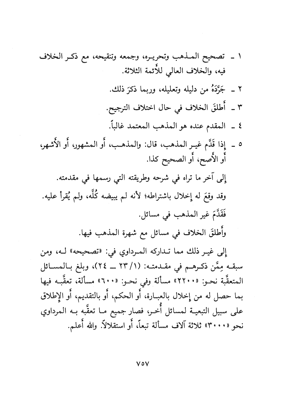 إلى غير ذلك مما تداركه المرداوي في: " تصحيحه " له، ومن سبقه ممن ذكرهم في مقدمته: (١/٢٣- ٢٤) ، وبلغ بالمسائل المتعقبة نحو: " ٢٢٠٠ " مسألة وفي نحو: " ٦٠٠ " مسألة، تعقبه فيها بما حصل له من إخلال بالعبارة، أو الحكم، أو بالتقديم، أو الإطلاق على سبيل التبعية لمسائل أخر فصار جميع ما تعقبه به المرداوي نحو " ٣٠٠٠ " ثلاثة آلاف مسألة تبعاً أو استقلالا والله أعلم.