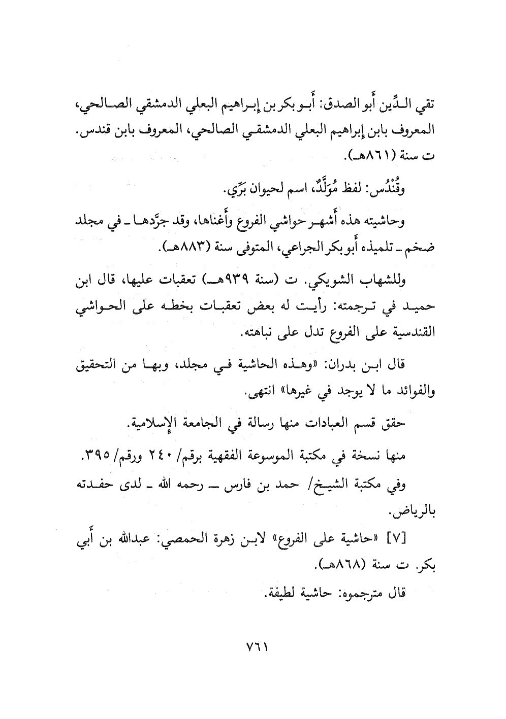 تقي الدين أبو الصدق: أبو بكر بن إبراهيم البعلي الدمشقي الصالحي، المعروف بابن إبراهيم البعلي الدمشقي الصالحي، المعروف بابن قندس ت سنة (٨٦١ هـ)