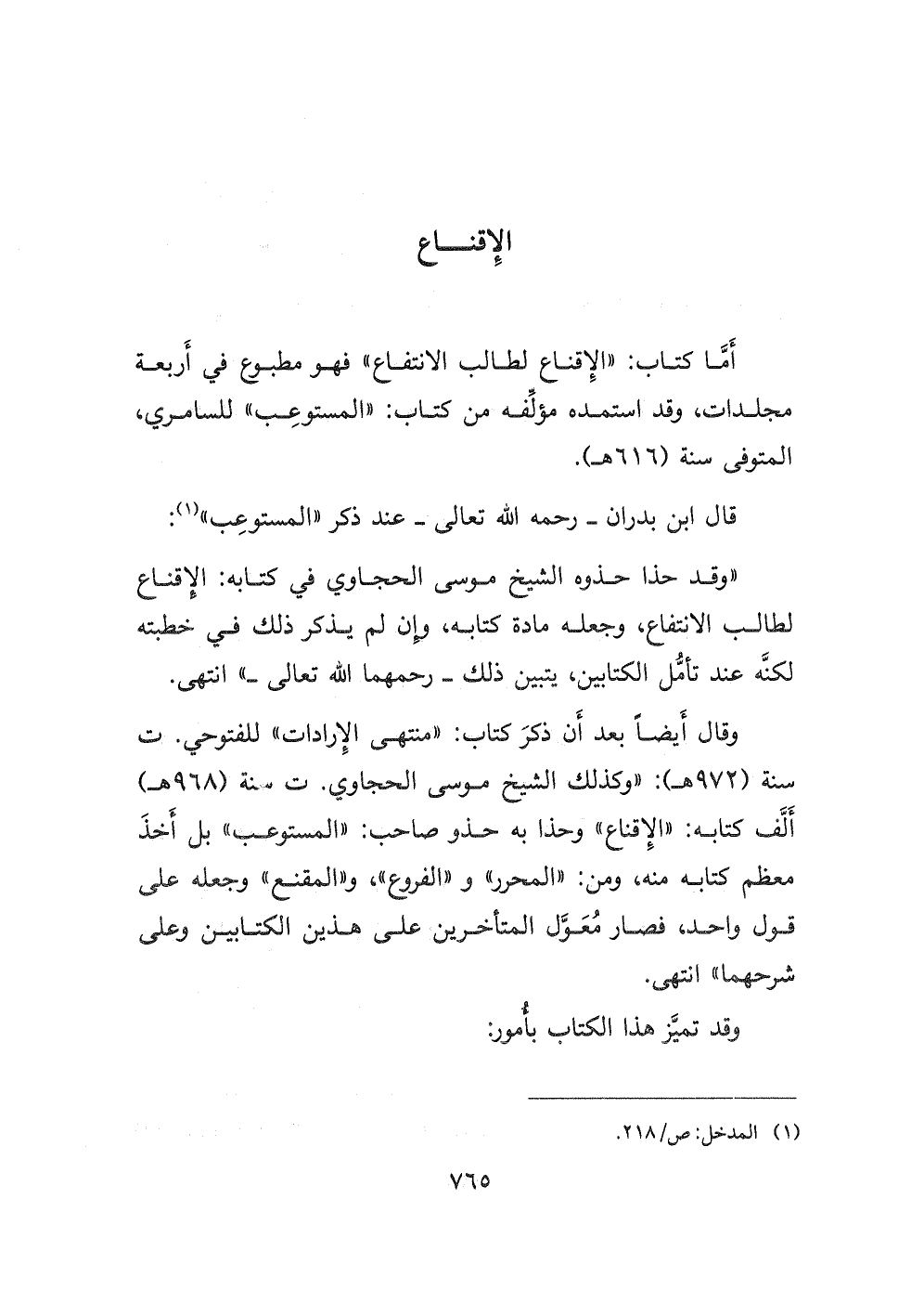 " وقد حذا حذوه الشيخ موسى الحجاوي في كتابه: الإقناع لطالب الانتفاع، وجعله مادة كتابه، وإن لم يذكر ذلك في خطبته لكنه عند تأمل الكتابين، يتبين ذلك - رحمهما الله تعالى- " انتهى. وقال أيضاً بعد أن ذكر كتاب: منتهى الإرادات " للفتوحي ت سنة (٩٧٢ هـ) : " وكذلك الشيخ موسى الحجاوي ت سنة (٩٦٨ هـ) ألف كتابه: " الإقناع " وحذا به حذو صاحب: " المستوعب " بل أخذ معظم كتابه منه، ومن: " المحرر " و " الفروع "، و " المقنع " وجعله على قول واحد، فصار معول المتأخرين على هذين الكتابين وعلى شرحهما " انتهى.