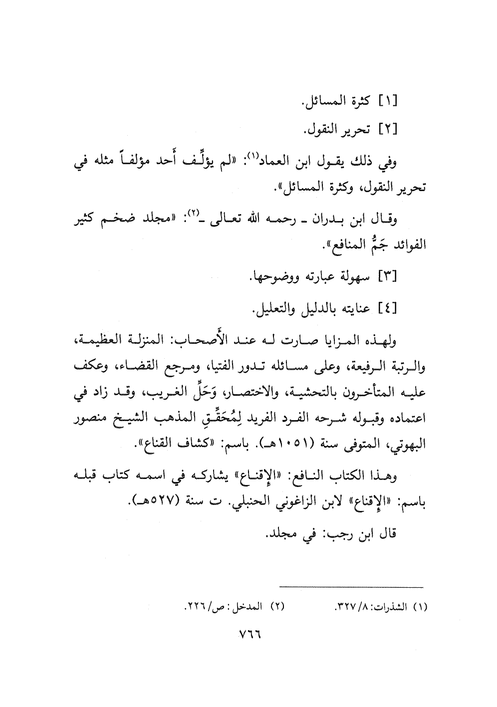 وفي ذلك يقول ابن العماد (١) : " لم يؤلف أحد مؤلفاً مثله في تحرير النقول، وكثرة المسائل ".