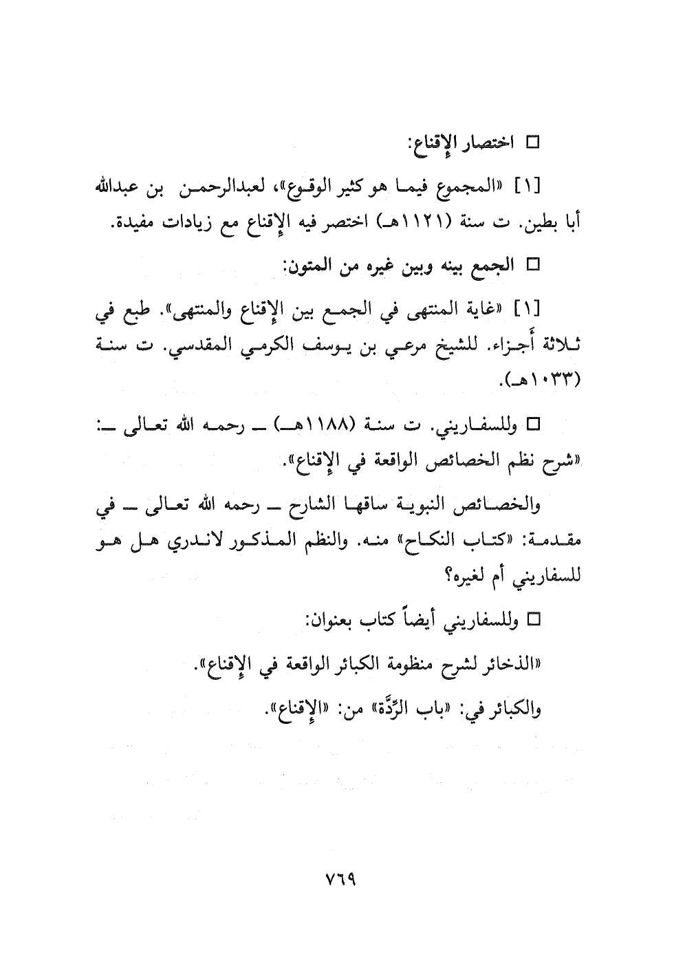 - وللسفاريني ت سنة (١١٨٨ هـ) - رحمه الله تعالى-: " شرح نظم الخصائص الواقعة في الإقناع ".