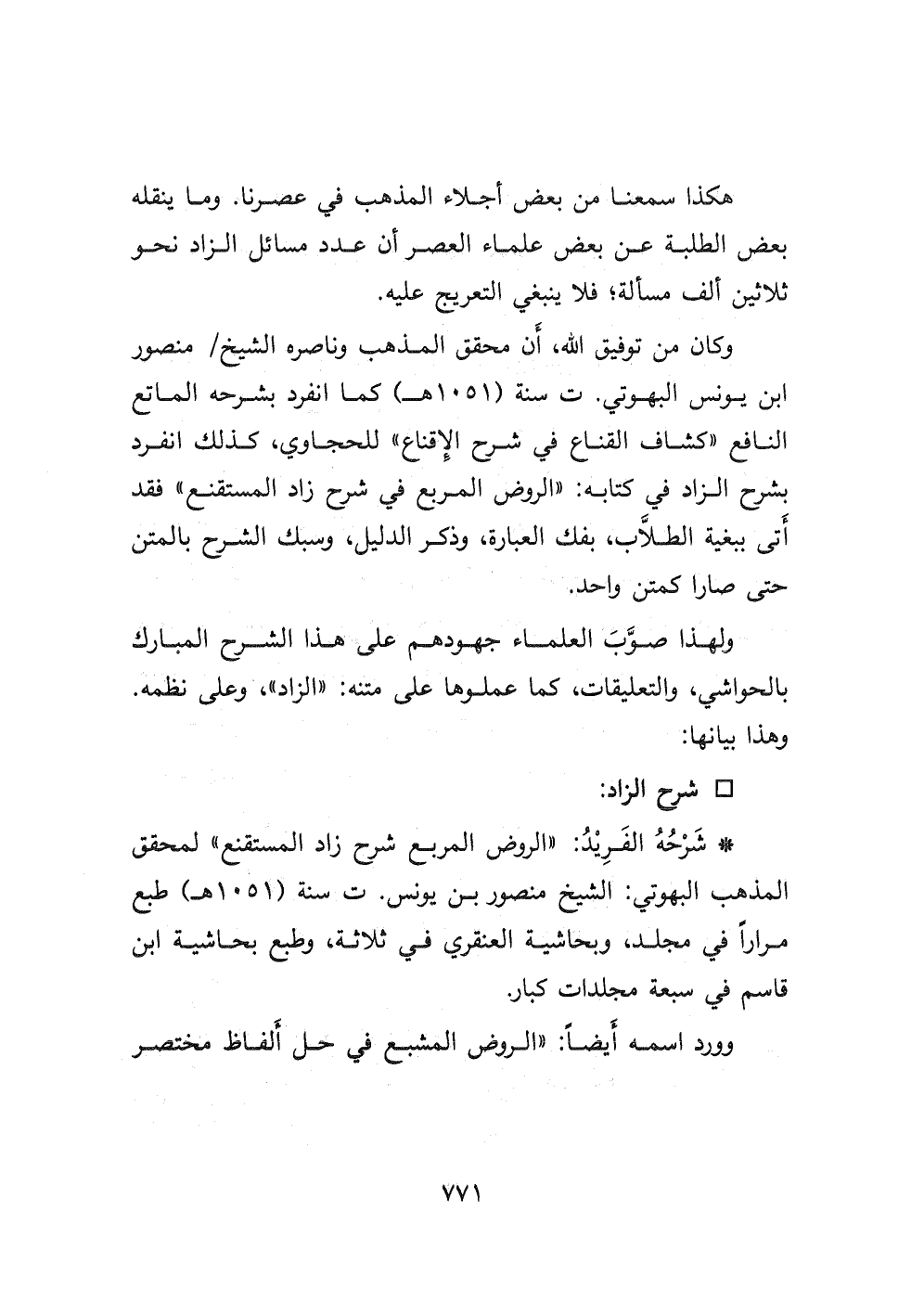 - شرحه الفريد: " الروض المربع شرح زاد المستقنع " لمحقق المذهب البهوتي: الشيخ منصور بن يونس ت سنة (١٠٥١ هـ) طبع مراراً في مجلد، وبحاشية العنقري في ثلاثة، وطبع بحاشية ابن قاسم في سبعة مجلدات كبار.