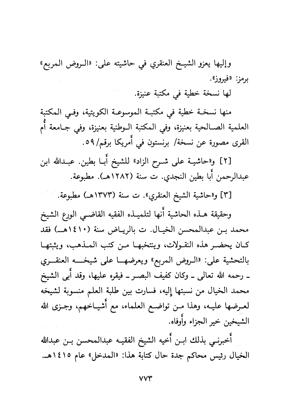 ٣- و " حاشية الشيخ العنقري " ت سنة (١٣٧٣ هـ) مطبوعة. وحقيقة هذه الحاشية أنها لتلميذه الفقيه القاضي الورع الشيخ محمد بن عبد المحسن الخيال ت بالرياض سنة (١٤١٠ هـ) فقد كان يحضر هذه النقولات، وينتخبها من كتب المذهب، ويثبتها بالتحشية على: " الروض المربع " ويعرضها على شيخه العنقري - رحمه الله تعالى - وكان كفيف البصر- فيقره عليها، وقد أبى الشيخ محمد الخيال من نسبتها إليه، فسارت بين طلبة العلم منسوبة لشيخه لعرضها عليه، وهذا من تواضع العلماء، مع أشياخهم، وجزى الله الشيخين خير الجزاء وأوفاه.