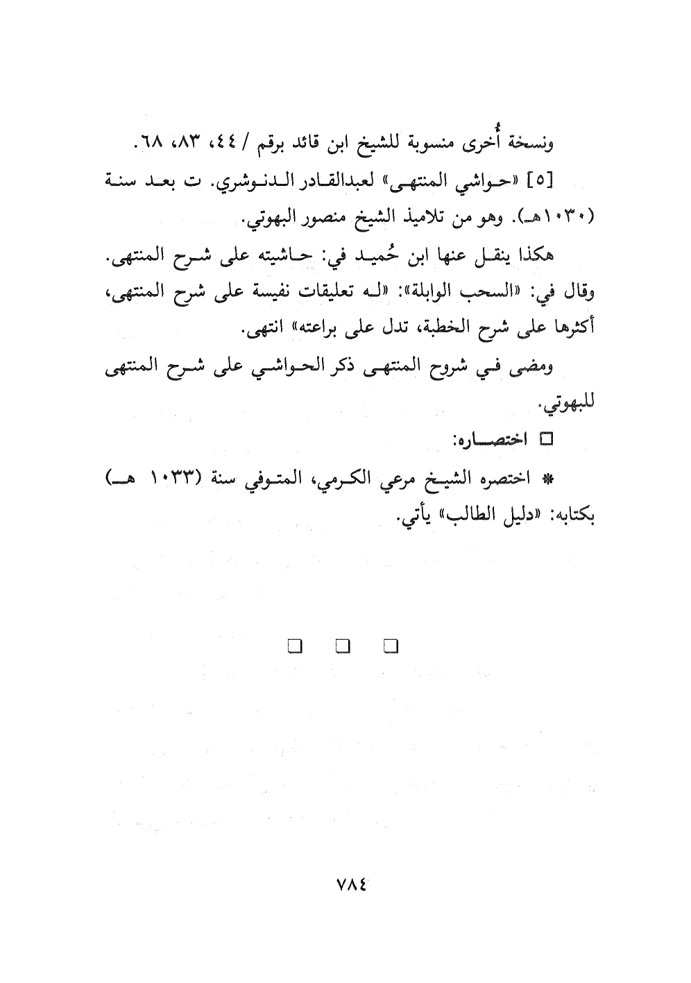 ٥- " حواشي المنتهى " لعبد القادر الدنوشري ت بعد سنة (١٠٣٠ هـ) . وهو من تلاميذ الشيخ منصور البهوتي.