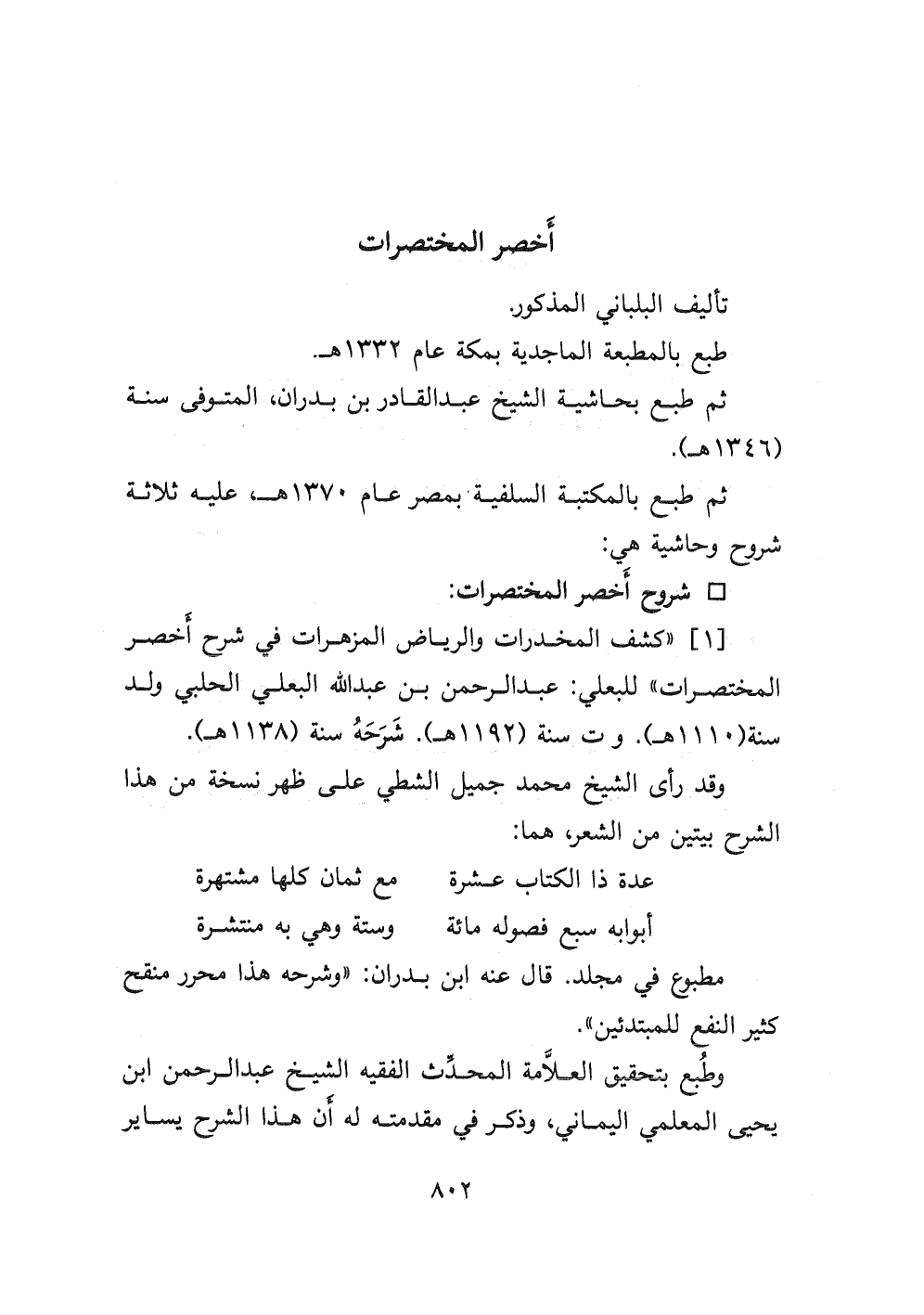 ١- " كشف المخدرات والرياض المزهرات في شرح أخصر المختصرات " للبعلي: عبد الرحمن بن عبد الله البعلي الحلبي ولد سنة (١١١٠ هـ) . وت سنة (١١٩٢ هـ) . شرحه سنة (١١٣٨ هـ) .