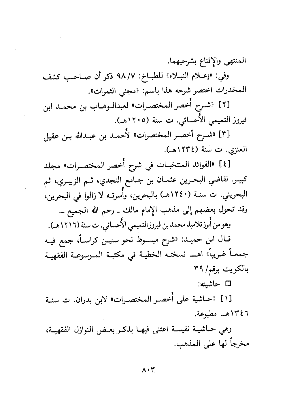 ٤- " الفوائد المنتخبات في شرح أخصر المختصرات " مجلد كبير لقاضي البحرين عثمان بن جامع النجدي، ثم الزبيري، ثم البحريني ت سنة (١٢٤٠ هـ) بالبحرين، وأسرته لازالوا في البحرين، وقد تحول بعضهم إلى مذهب الإمام مالك- رحم الله الجميع-. وهو من أبرز تلاميذ محمد بن فيروز التميمي الأحسائي ت سنة (١٢١٦ هـ) .