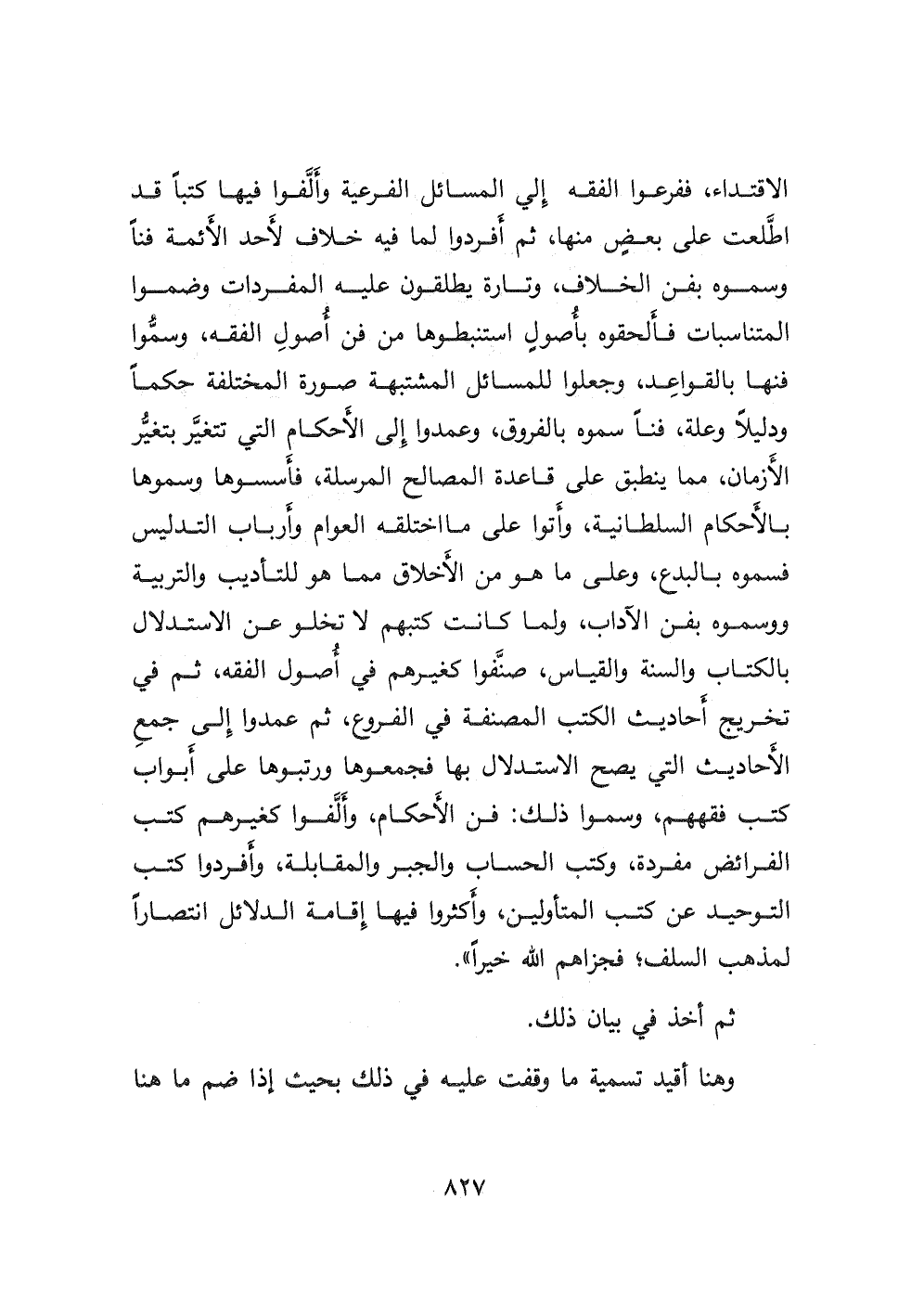 الاقتداء، ففرعوا الفقه إلى المسائل الفرعية وألفوا فيها كتباً قد اطلعت على بعض منها، ثم أفردوا لما فيه خلاف لأحد الأئمة فناً وسموه بفن الخلاف، وتارة يطلقون عليه المفردات وضموا المتناسبات فألحقوه بأصول استنبطوها من فن أصول الفقه، وسموا فنها بالقواعد، وجعلوا للمسائل المشتبهة صورة المختلفة حكماً ودليلاً وعلة، فناً سموه بالفروق، وعمدوا إلى الأحكام التي تتغير بتغير الأزمان، مما ينطبق على قاعدة المصالح المرسلة، فأسسوها وسموها بالأحكام السلطانية، وأتوا على ما اختلقه العوام وأرباب التدليس فسموه بالبدع، وعلى ما هو من الأخلاق مما هو للتأديب والتربية ووسموه بفن الآداب، ولما كانت كتبهم لا تخلو عن الاستدلال بالكتاب والسنة والقياس، صنفوا كغيرهم في أصول الفقه، ثم في تخريج أحاديث الكتب المصنفة في الفروع، ثم عمدوا إلى جمع الأحاديث التي يصح الاستدلال بها فجمعوها ورتبوها على أبواب كتب فقههم، وسموا ذلك: فن الأحكام، وألفوا كغيرهم كتب الفرائض مفردة، وكتب الحساب والجبر والمقابلة، وأفردوا كتب التوحيد عن كتب المتأولين، وأكثروا فيها إقامة الدلائل انتصاراً لمذهب السلف؛ فجزاهم الله خيراً ".