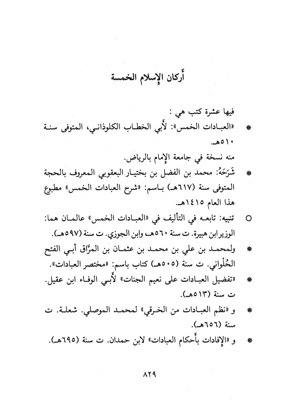 - " العبادات الخمس " لأبي الخطاب الكلوذاني، المتوفى سنة ٥١٠ هـ. منه نسخة في جامعة الإمام بالرياض.