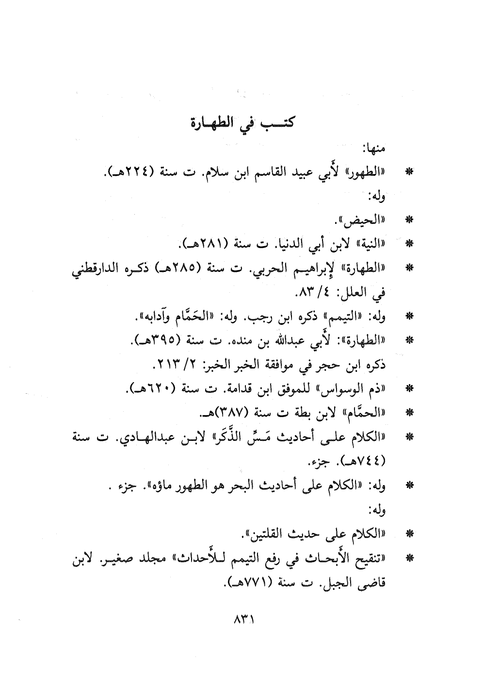 - " الطهارة " لإبراهيم الحربي ت سنة (٢٨٥ هـ) ذكره الدارقطني في العلل: ٤/٨٣.