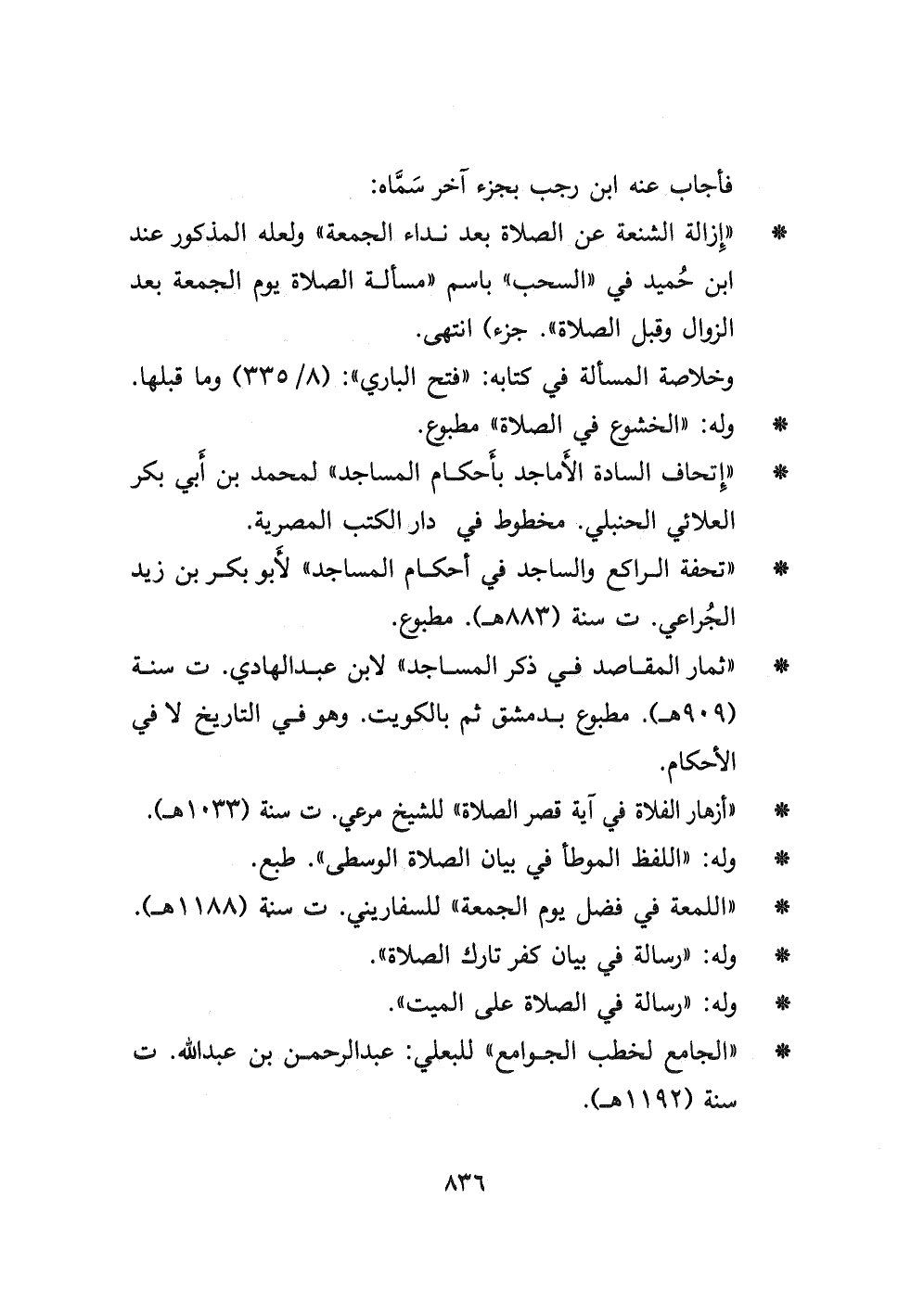 - " إزالة الشنعة عن الصلاة بعد نداء الجمعة " ولعله المذكور عند ابن حميد في " السحب " باسم مسألة الصلاة يوم الجمعة بعد الزوال وقبل الصلاة ". جزء) انتهى.