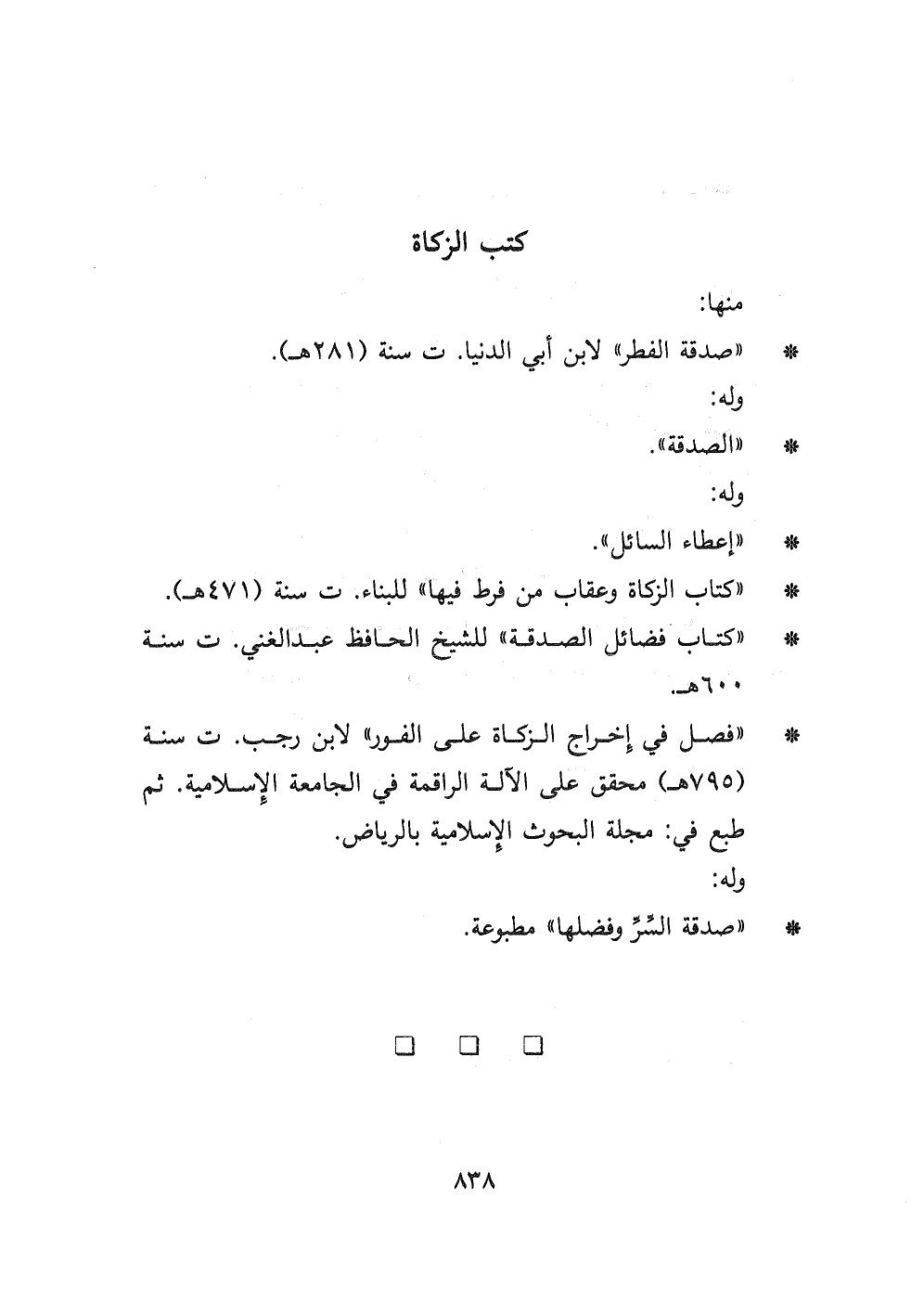 - " فصل في إخراج الزكاة على الفور " لابن رجب ت سنة (٧٩٥ هـ) محقق على الآلة الراقمة في الجامعة الإسلامية. ثم طبع في: مجلة البحوث الإسلامية بالرياض.