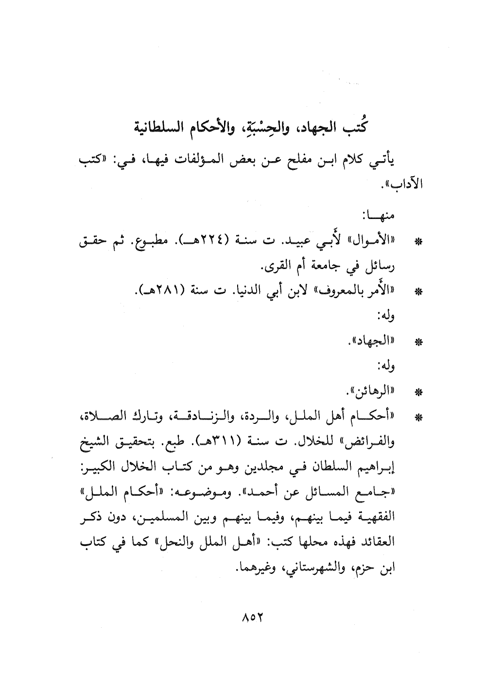 - " أحكام أهل الملل، والردة، والزنادقة، وتارك الصلاة، والفرائض " للخلال ت سنة (٣١١ هـ) . طبع بتحقيق الشيخ إبراهيم السلطان في مجلدين وهو من كتاب الخلال الكبير " جامع المسائل عن أحمد ". وموضوعه: " أحكام الملل " الفقهية فيما بينهم، وفيما بينهم وبين المسلمين، دون ذكر العقائد فهذه محلها كتب: " أهل الملل والنحل " كما في كتاب ابن حزم، والشهرستاني، وغيرهما.