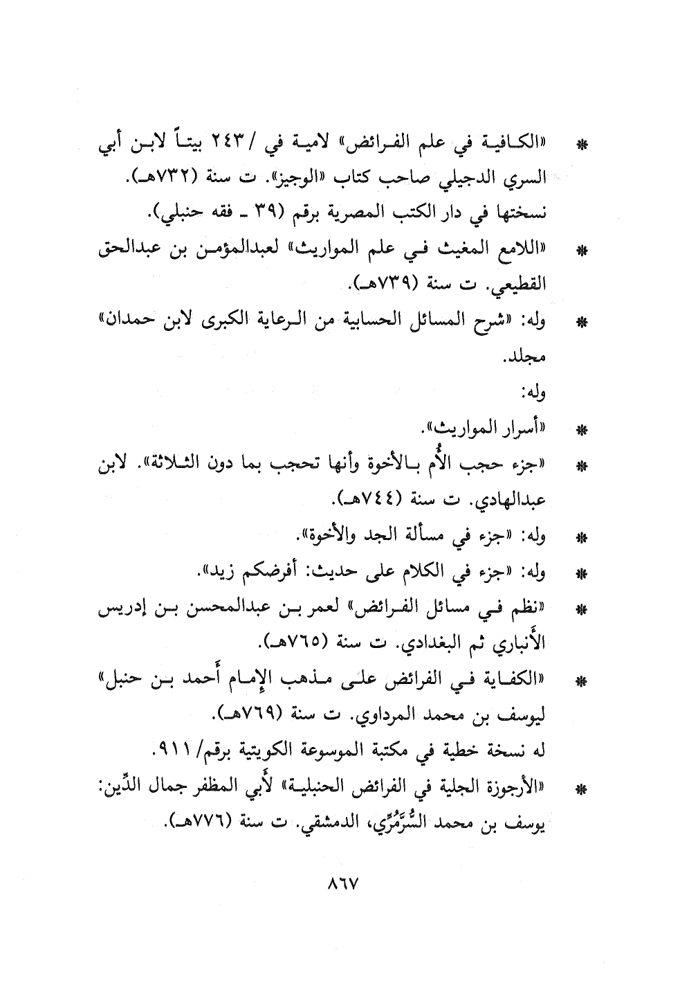 - " الكفاية في الفرائض عك مذهب الإمام أحمد بن حنبل " ليوسف بن محمد المرداوي ت سنة (٧٦٩ هـ) .