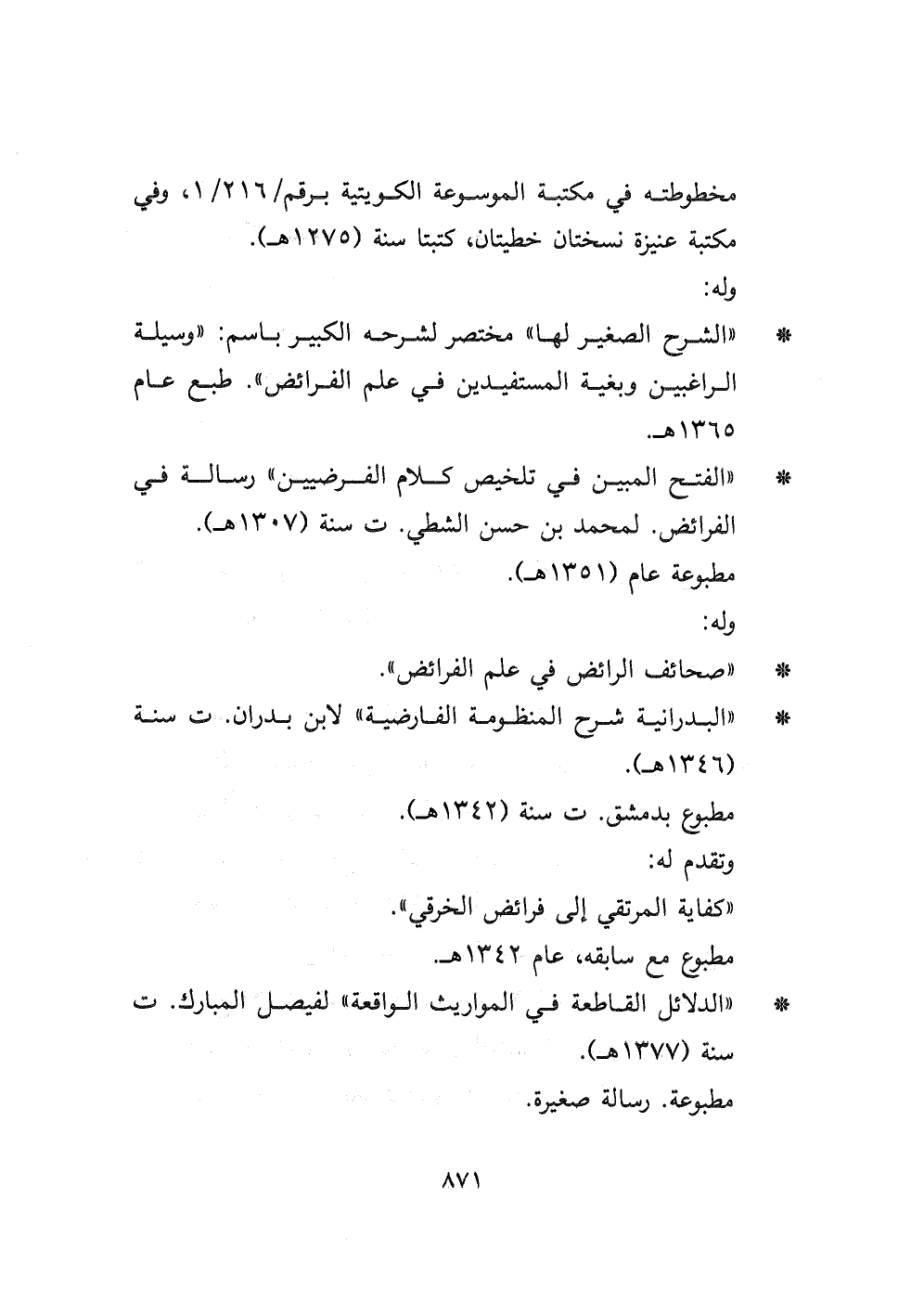 - " الفتح المبين في تلخيص كلام الفرضيين " رسالة في الفرائض. لمحمد بن حسن الشطي ت سنة (١٣٠٧ هـ) . مطبوعة عام (١٣٥١ هـ) .