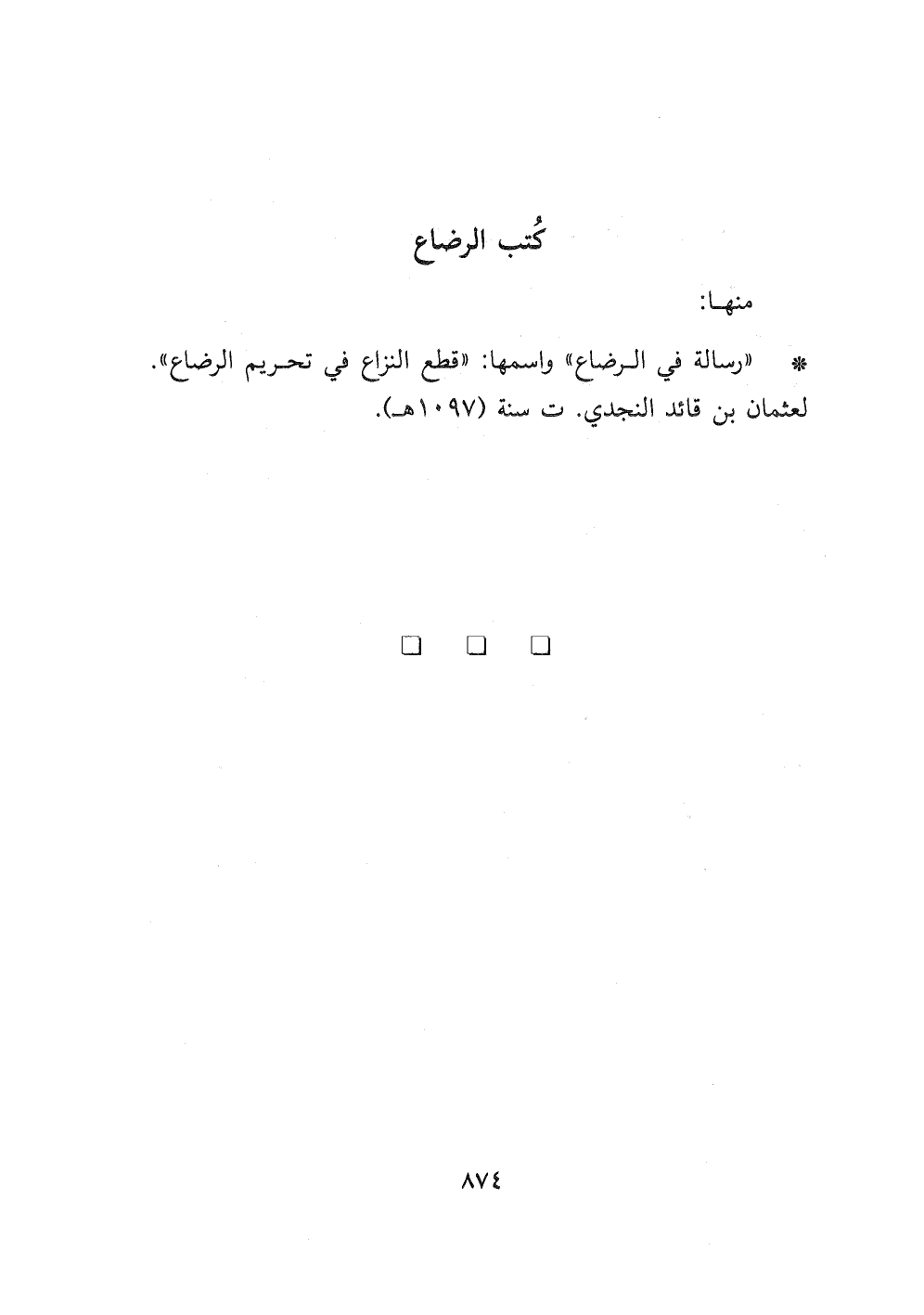 - " رسالة في الرضاع " واسمها: " قطع النزاع في تحريم الرضاع " لعثمان بن قائد النجدي ت سنة (١٠٩٧ هـ) .