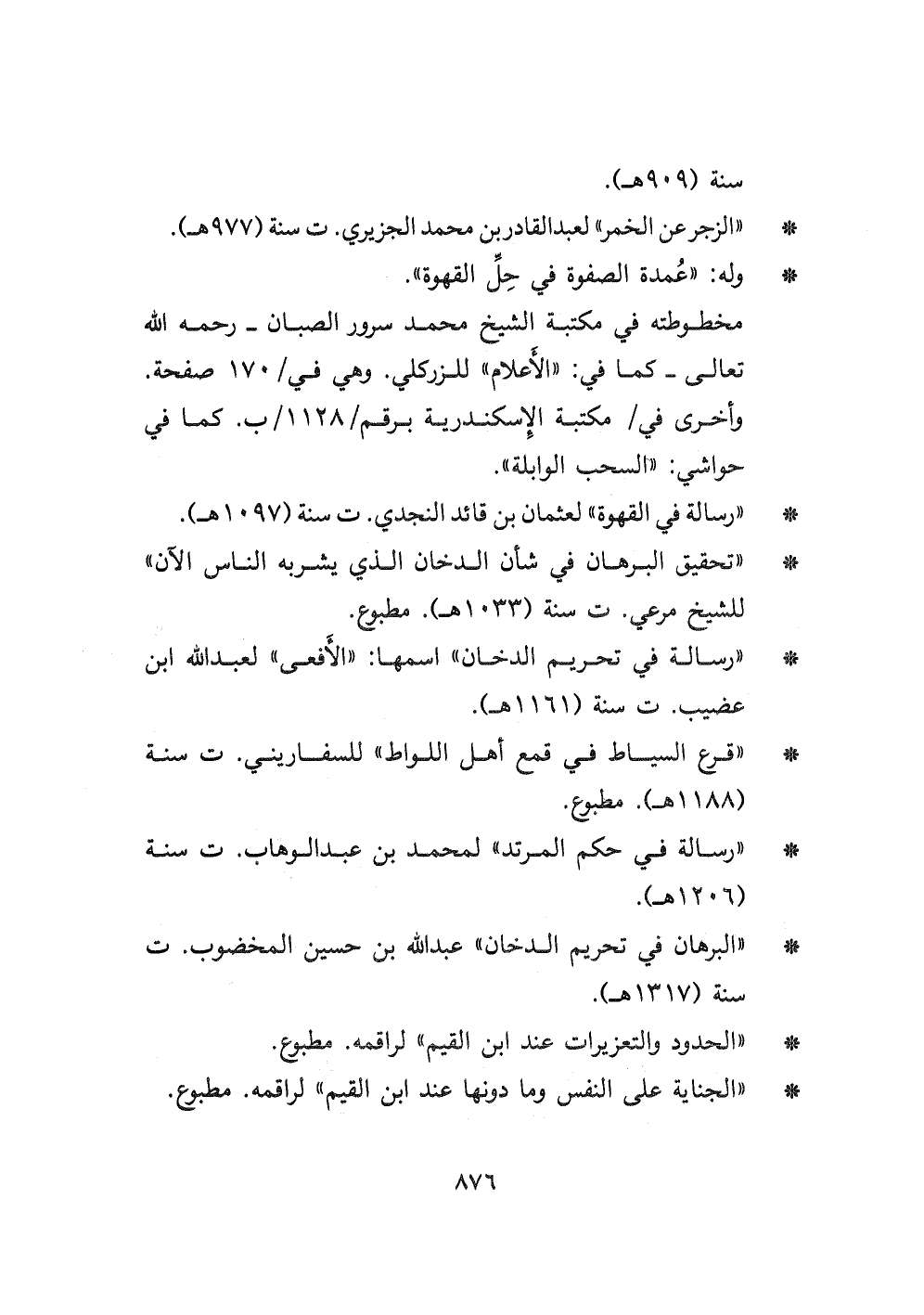 - " رسالة في تحريم الدخان " اسمها: " الأفعى " لعبد الله ابن عضيب ت سنة (١١٦١ هـ) .