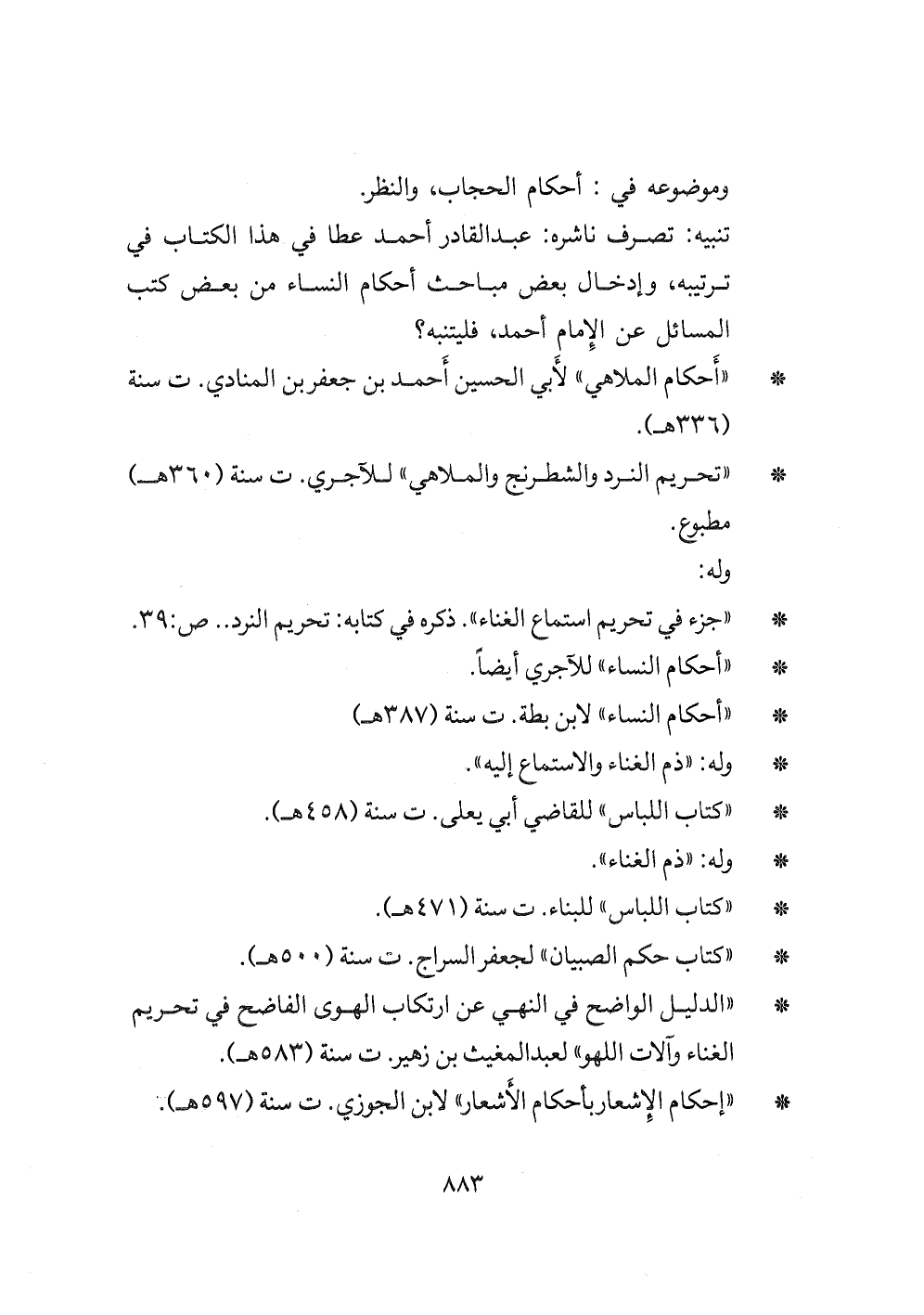 - " أحكام الملاهي " لأبي الحسين أحمد بن جعفر بن المنادي، ت سنة (٣٣٦ هـ) .