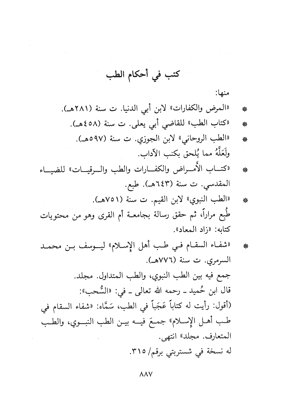 قال ابن حميد- رحمه الله تعالى- في: " السحب ": " أقول: رأيت له كتابا عجباً في الطب، سمَّاه: " شفاء السقام في طب أهل الإسلام " جمع فيه بين الطب النبوي، والطب المتعارف. مجلد " انتهى.