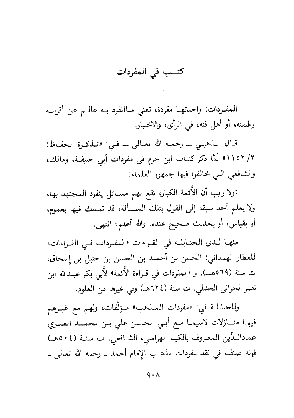 منها لدى الحنابلة في القراءات " المفردات في القراءات " للعطار الهمداني: الحسن بن أحمد بن الحسن بن حنبل بن إسحاق، ت سنة (٥٦٩ هـ) . و " المفردات في قراءة الأئمة " لأبي بكر عبد الله ابن نصر الحراني الحنبلي ت سنة (٦٢٤ هـ) وفي غيرها من العلوم. وللحنابلة في: مفردات المذهب " مؤلفات، ولهم مع غيرهم فيها منازلات لاسيما مع أبي الحسن علي بن محمد الطبري عماد الدين المعروف بالكيا الهراسي، الشافعي ت سنة (٥٠٤ هـ) فإنه صنف في نقد مفردات مذهب الإمام أحمد- رحمه الله تعالى-