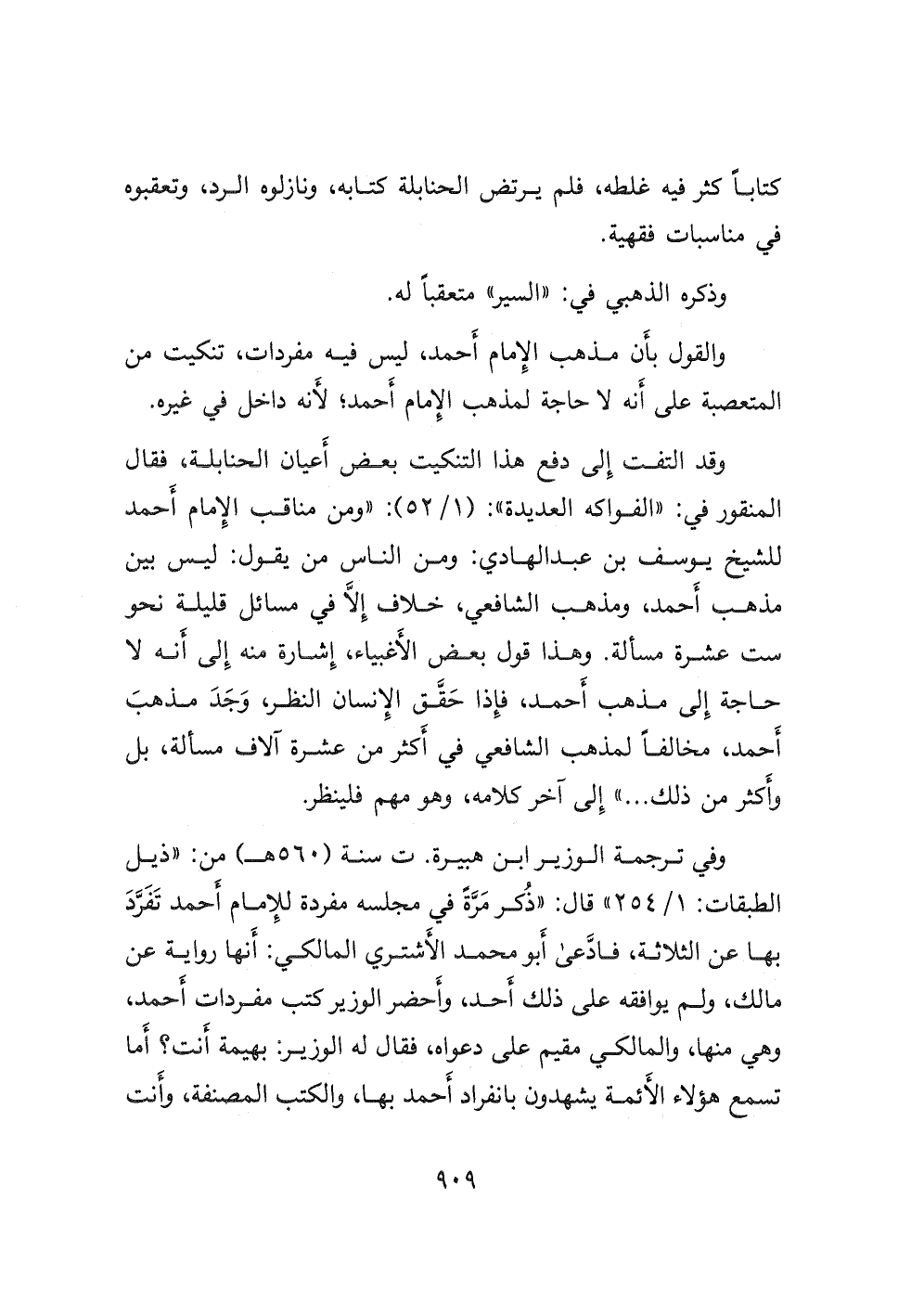 والقول بأن مذهب الإمام أحمد، ليس فيه مفردات، تنكيت من المتعصبة على أنه لا حاجة لمذهب الإمام أحمد؛ لأنه داخل في غيره. وقد التفت إلى دفع هذا التنكيت بعض أعيان الحنابلة فقال المنقور في: " الفواكه العديدة ": (١/ ٥٢) : " ومن مناقب الإمام أحمد للشيخ يوسف بن عبد الهادي: ومن الناس من يقول: ليس بين مذهب أحمد، ومذهب الشافعي، خلاف إلا في مسائل قليلة نحو ست عشرة مسألة. وهذا قول بعض الأغبياء، إشارة منه إلى أنه لا حاجة إلى مذهب أحمد، فإذا حقق الإنسان النظر وَجَدَ مذهب أحمد، مخالفاً لمذهب الشافعي في أكثر من عشرة آلاف مسألة، بل وأكثر من ذلك ... " إلى آخر كلامه، وهو مهم فلينظر.