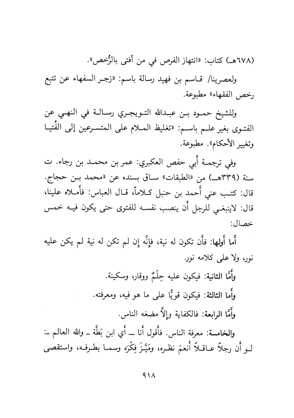 وفي ترجمة أبي حفص العكبري: عمر بن محمد بن رجاء ت سنة (٣٣٩ هـ) من " الطبقات " ساق بسنده عن " محمد بن حجاج. قال: كتب عني أحمد بن حنبل كلاماً، قال العباس: فأملاه علينا، قال: لا ينبغي للرجل أن ينصب نفسه للفتوى حتى يكون فيه خمس خصال:
