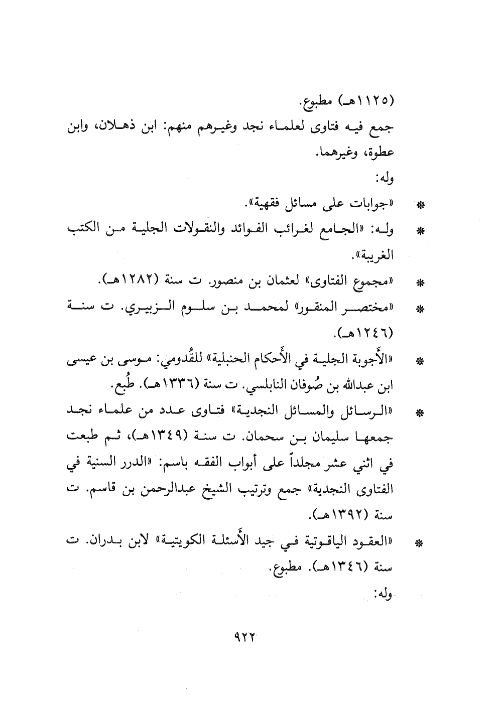 - الأجوبة الجلية في الأحكام الحنبلية " للقُدومي: موسى بن عيسى ابن عبد الله بن صُوفان النابلسي ت سنة (١٣٣٦ هـ) . طبع. " الرسائل والمسائل النجدية " فتاوى عدد من علماء نجد جمعها سليمان بن سحمان ت سنة (١٣٤٩ هـ) ، ثم طبعت في اثني عشر مجلداً على أبواب الفقه باسم: " الدرر السنية في الفتاوى النجدية " جمع وترتيب الشيخ عبد الرحمن بن قاسم ت سنة (١٣٩٢ هـ) .