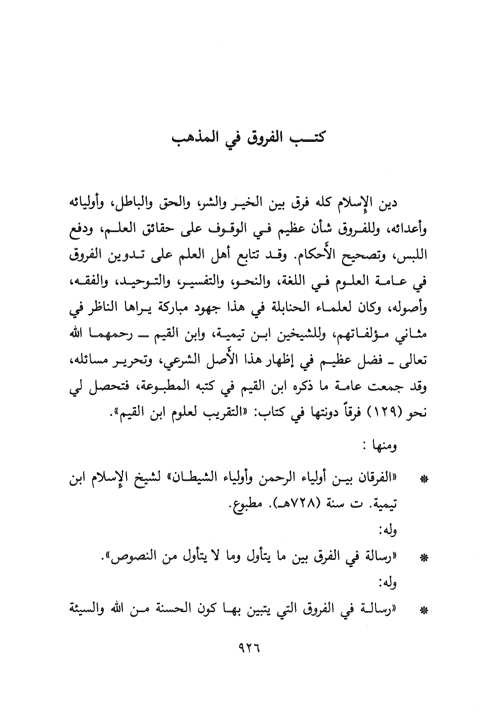 دين الإسلام كله فرق بين الخير والشر والحق والباطل، وأوليائه وأعدائه، وللفروق شأن عظيم في الوقوف على حقائق العلم، ودفع اللبس، وتصحيح الأحكام. وقد تتابع أهل العلم على تدوين الفروق في عامة العلوم في اللغة، والنحو والتفسير والتوحيد، والفقه، وأصوله، وكان لعلماء الحنابلة في هذا جهود مباركة يراها الناظر في مثاني مؤلفاتهم، وللشيخين ابن تيمية، وابن القيم- رحمهما الله تعالى- فضل عظيم في إظهار هذا الأصل الشرعي، وتحرير مسائله، وقد جمعت عامة ما ذكره ابن القيم في كتبه المطبوعة، فتحصل لي نحو (١٢٩) فرقاً دونتها في كتاب: " التقريب لعلوم ابن القيم ".