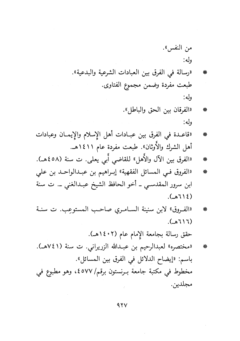 - " قاعدة في الفرق بين عبادات أهل الإسلام والإيمان وعبادات أهل الشرك والأوثان ". طبعت مفردة عام ١٤١١ هـ.