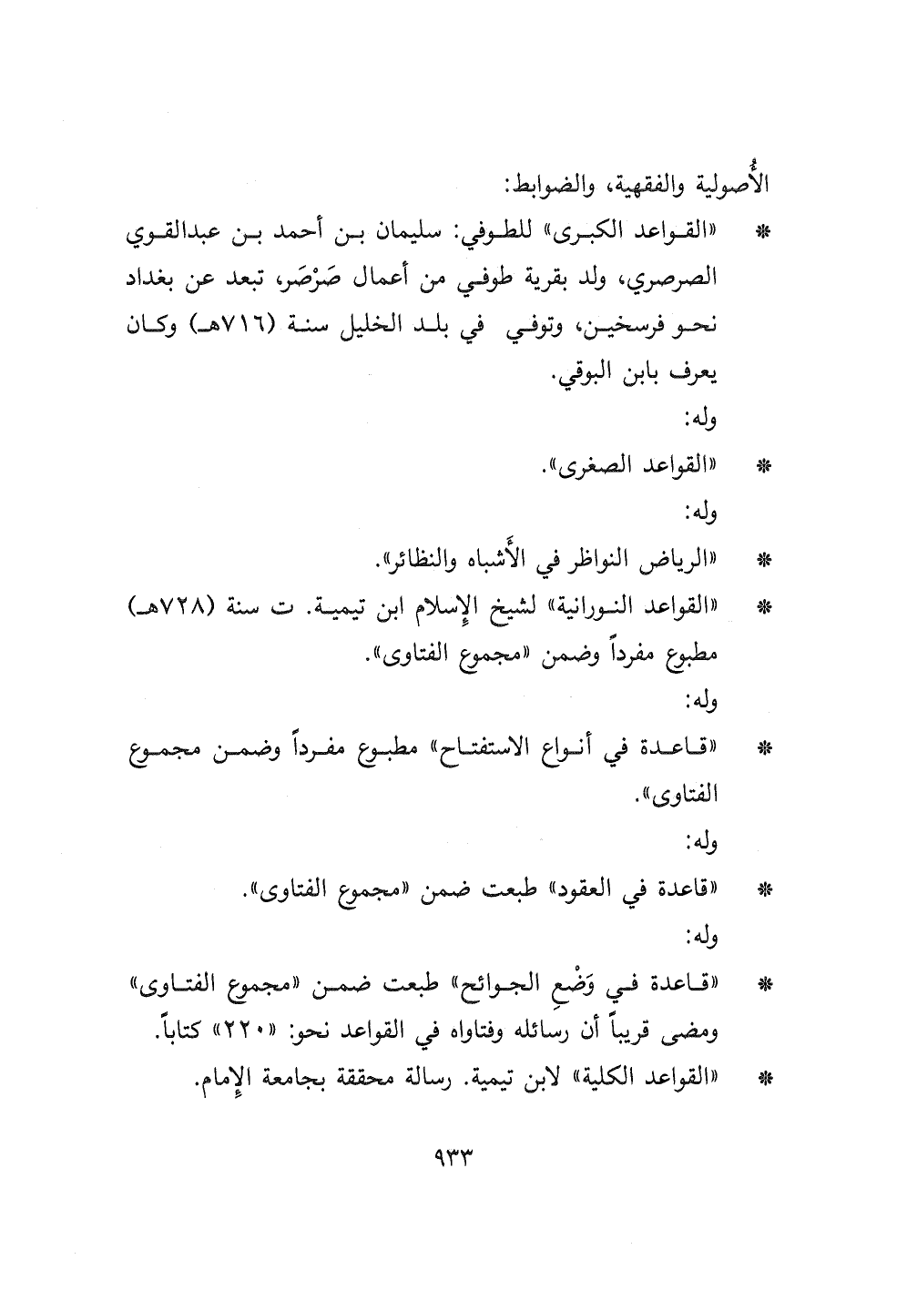 - " القواعد الكبرى، للطوفي: سليمان بن أحمد بن عبد القوي الصرصري، ولد بقرية طوفي من أعمال صرصر، تبعد عن بغداد نحو فرسخين، وتوفي في بلد الخليل سنة (٧١٦ هـ) وكان يعرف بابن البوقي.