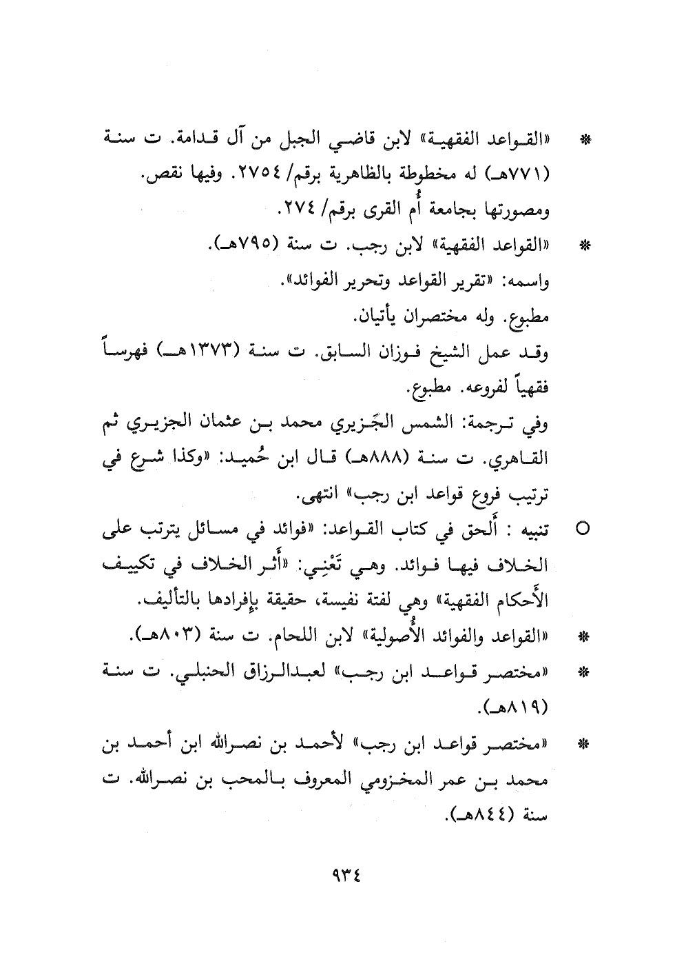 - " القواعد الفقهية " لابن قاضي الجبل من آل قدامة ت سنة (٧٧١ هـ) له مخطوطة بالظاهرية برقم/٢٧٥٤. وفيها نقص. ومصورتها بجامعة أم القرى برقم/٢٧٤.