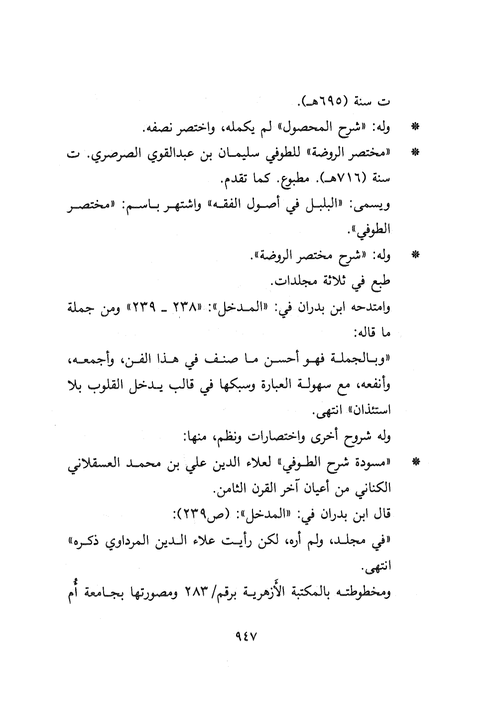 - " مسودة شرح الطوفي " لعلاء الدين علي بن محمد العسقلاني الكناني من أعيان آخر القرن الثامن.