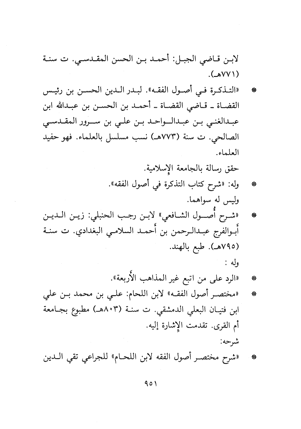- " التذكرة في أصول الفقه " لبدر الدين الحسن بن رئيس القضاة - قاضي القضاة - أحمد بن الحسن بن عبد الله ابن عبد الغني بن عبد الواحد بن علي بن سرور المقدسي الصالحي ت سنة (٧٧٣ هـ) نسب مسلسل بالعلماء فهو حفيد العلماء.