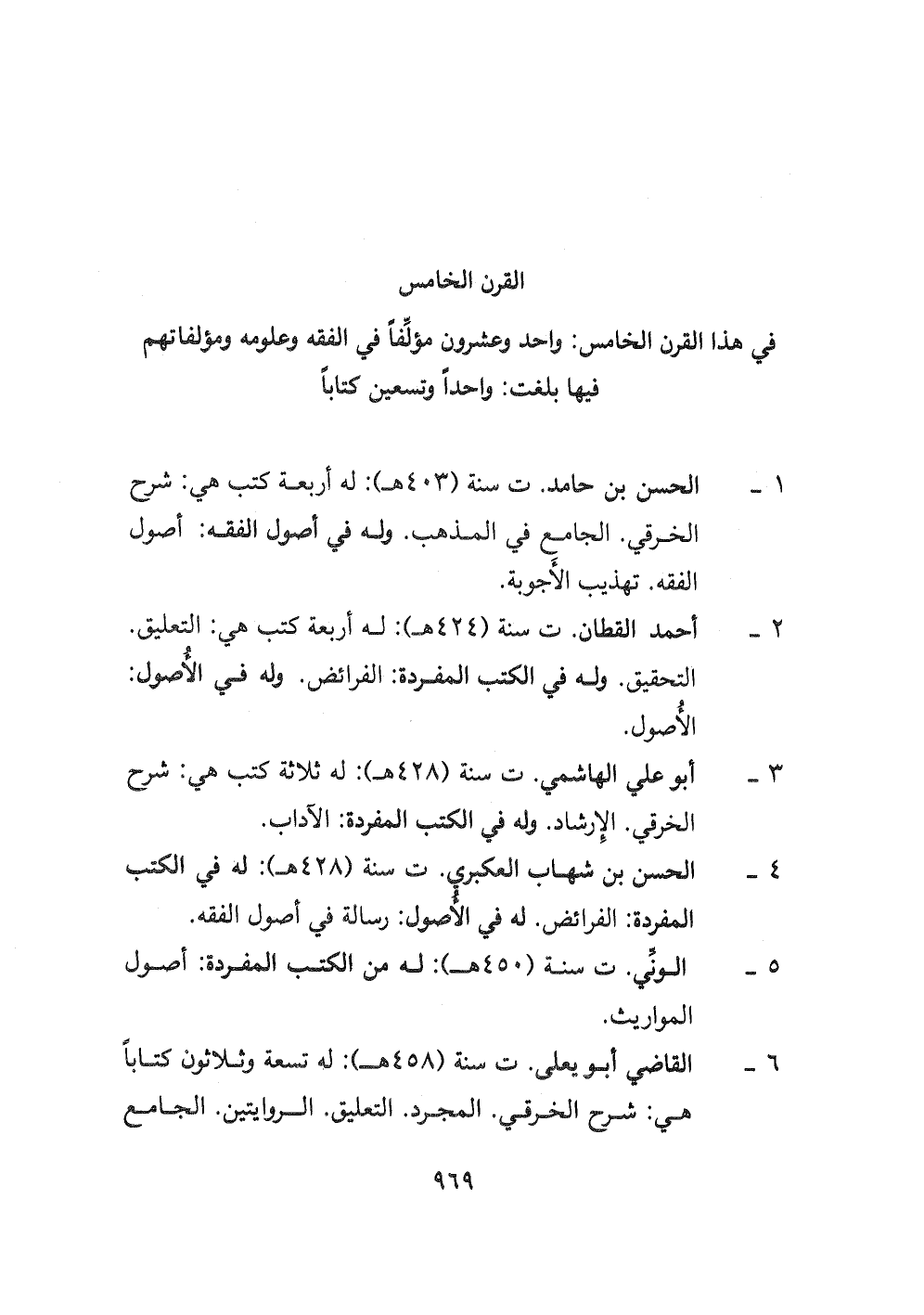٦- القاضي أبو يعلى ت سنة (٤٥٨ هـ) : له تسعة وثلاثون كتابا هي: شرح الخرقي. المجرد. التعليق. الروايتين. الجامع