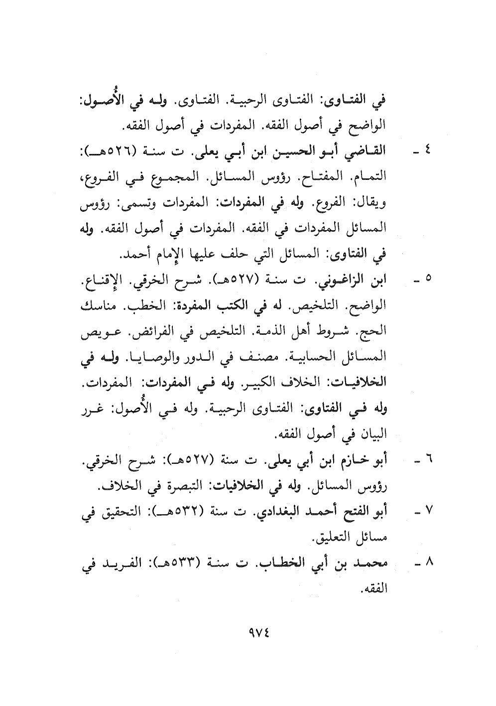 ٤- القاضي أبو الحسين ابن أبي يعلى ت سنة (٥٢٦ هـ) : التمام. المفتاح. رؤوس المسائل. المجموع في الفروع، ويقال: الفروع. وله في المفردات: المفردات وتسمى: رؤوس المسائل المفردات في الفقه. المفردات في أصول الفقه. وله في الفتاوى: المسائل التي حلف عليها الإمام أحمد.