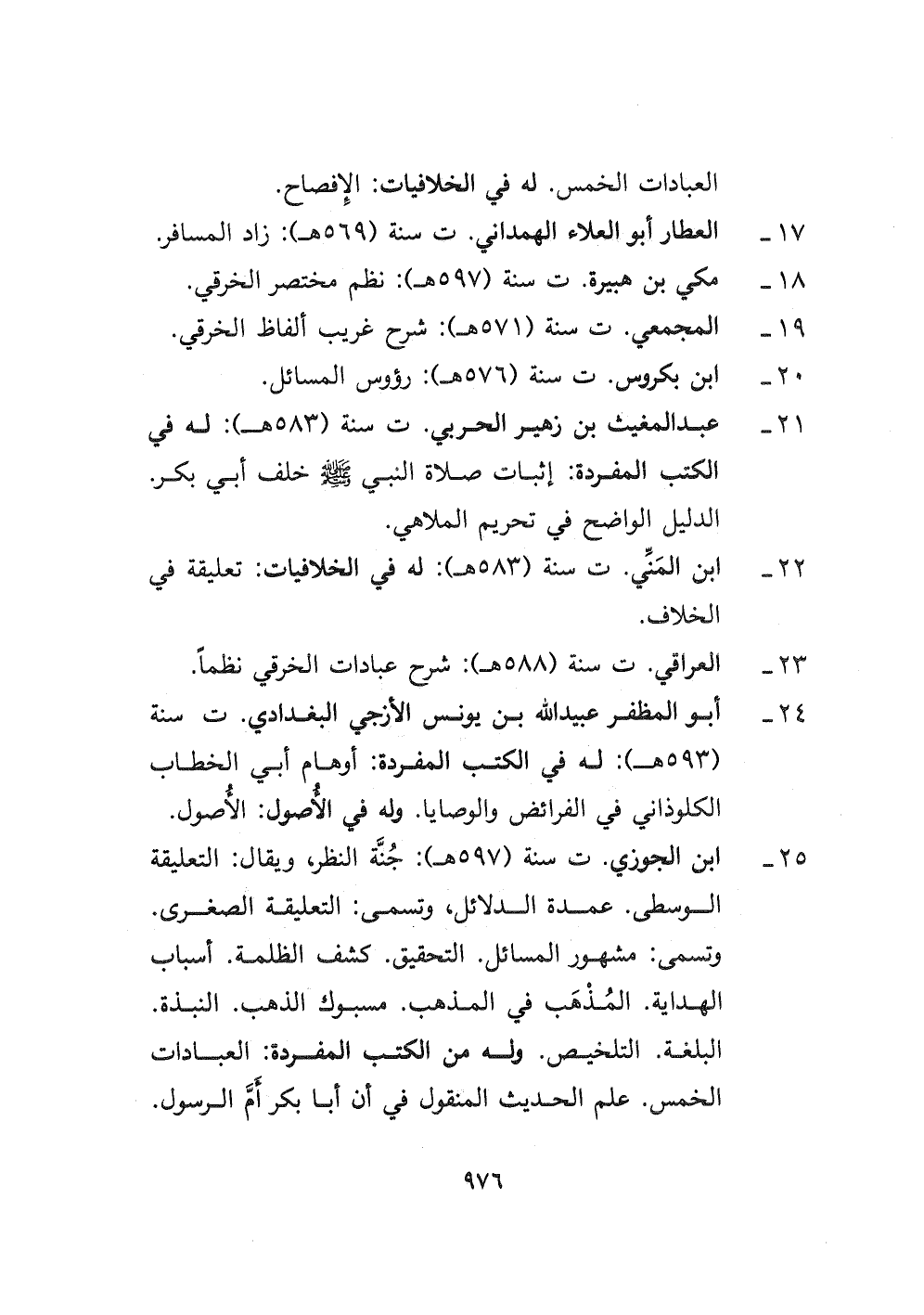 ٢٥- ابن الجوزي ت سنة (٥٩٧ هـ) : جُنَّة النظر ويقال: التعليقة الوسطى. عمدة الدلائل، وتسمى: التعليقة الصغرى. وتسمى: مشهور المسائل. التحقيق. كشف الظلمة. أسباب الهداية. المُذهَب في المذهب. مسبوك الذهب. النبذة. البلغة. التلخيص. وله من الكتب المفردة: العبادات الخمس. علم الحديث المنقول في أن أبا بكر أَمَّ الرسول.