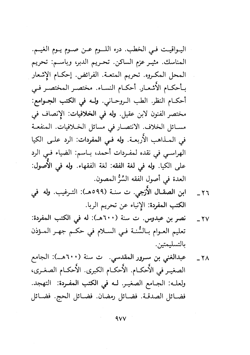 ٢٨- عبد الغني بن سرور المقدسي ت سنة (٦٠٠ هـ) : الجامع الصغير في الأحكام. الأحكام الكبرى. الأحكام الصغرى، ولعله: الجامع الصغير له في الكتب المفردة: التهجد. فضائل الصدقة. فضائل رمضان. فضائل الحج. فضائل